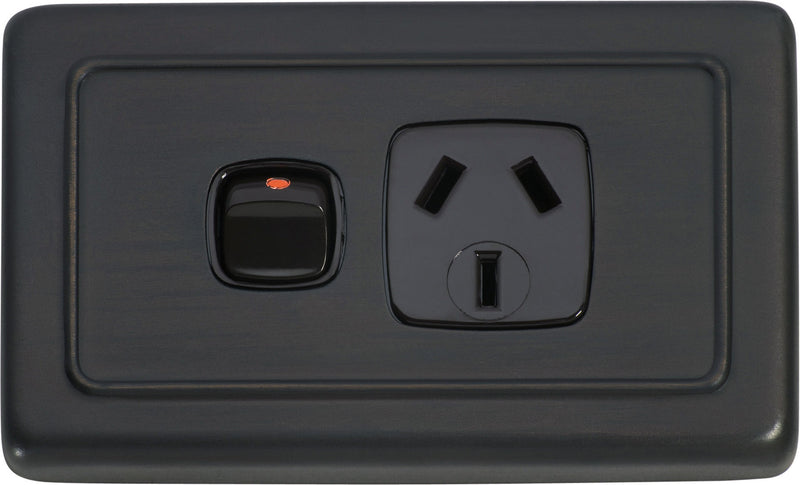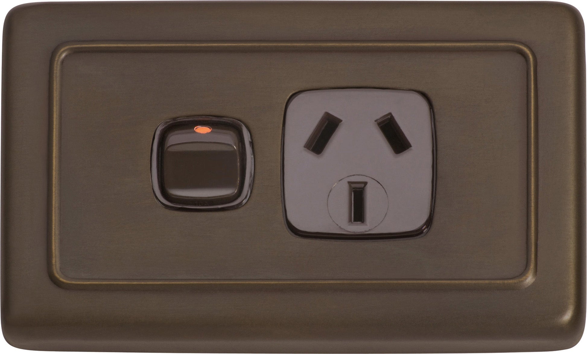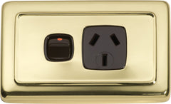 Flat plate sockets with rocker switches and brass covers. Available in single or double socket with 1, 2 or 3 switches with white or brown HPM mechanisms.