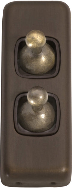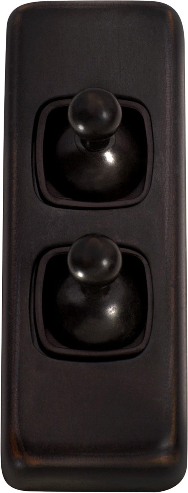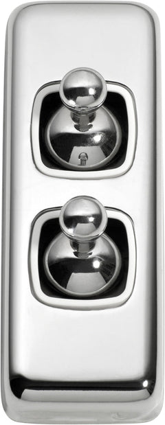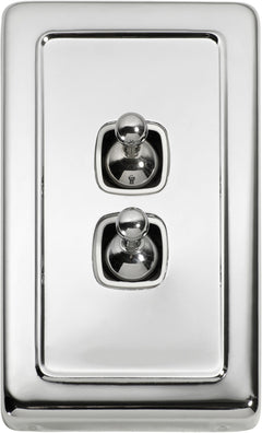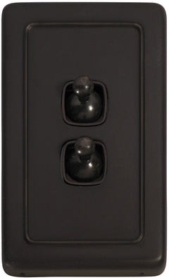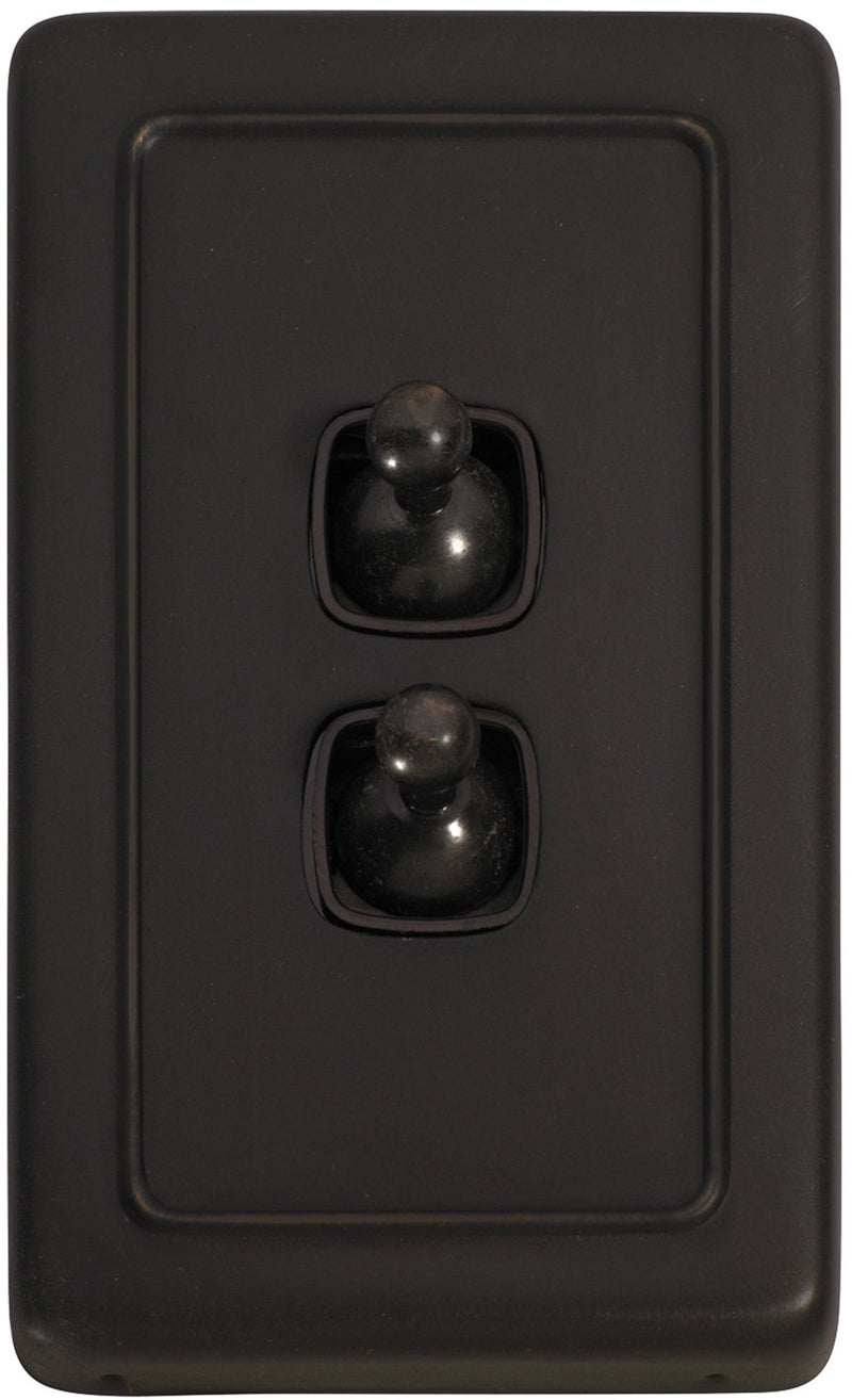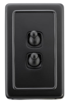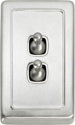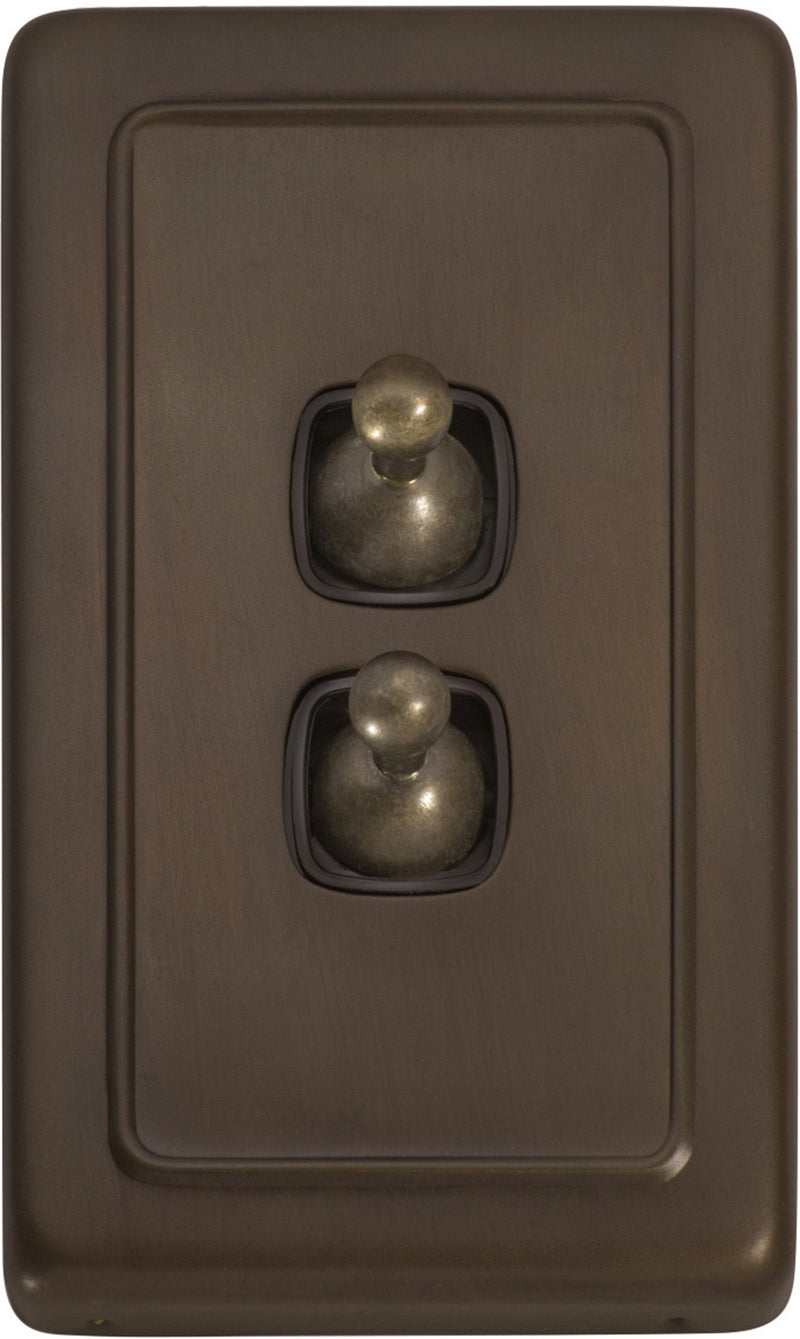 Flat plate 2 gang toggle switches with brass covers and HPM mechanisms. Matching sockets and compatible accessories also available.
