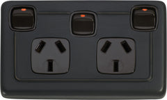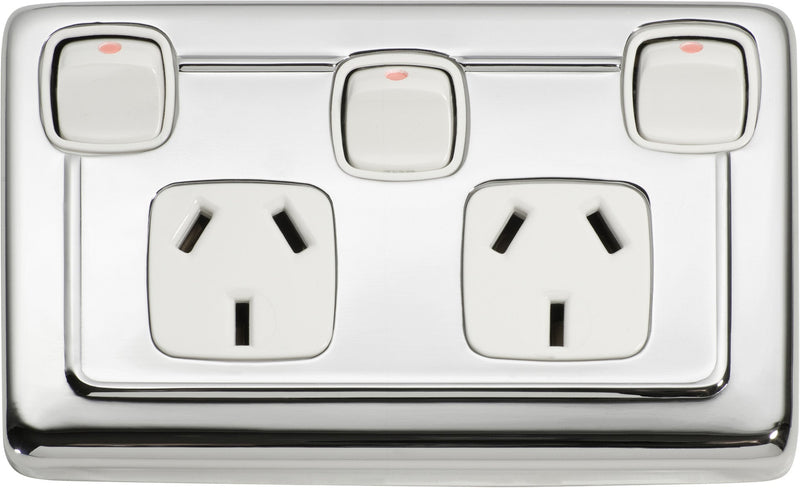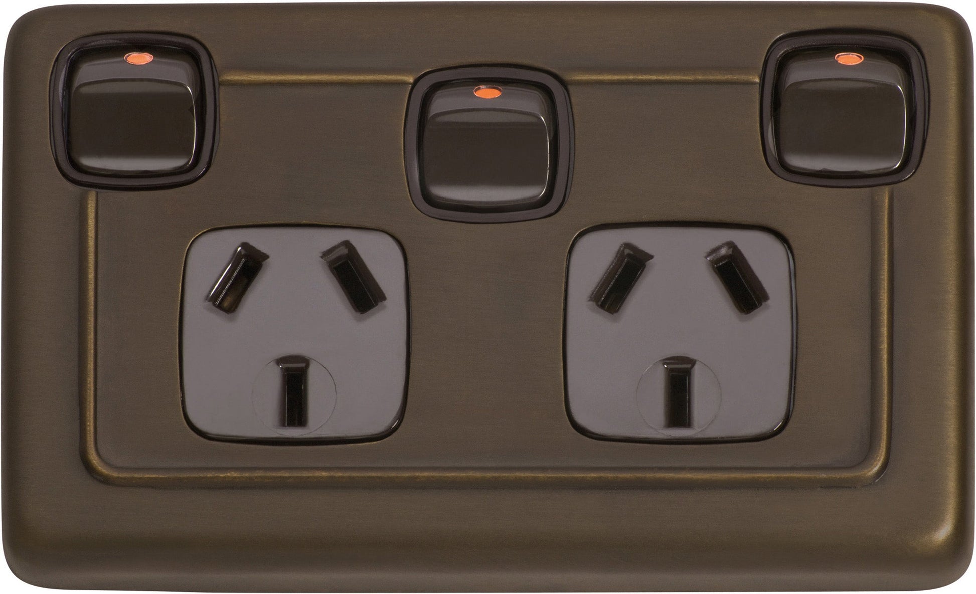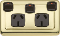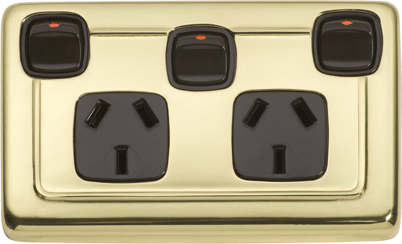 Flat plate sockets with rocker switches and brass covers. Available in single or double socket with 1, 2 or 3 switches with white or brown HPM mechanisms.