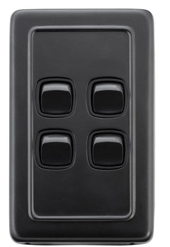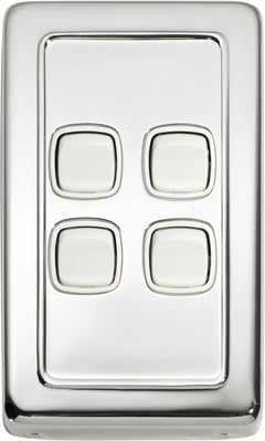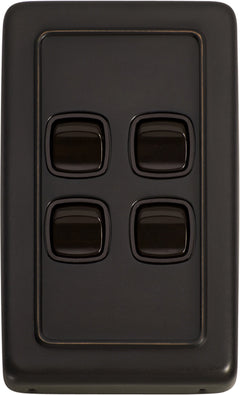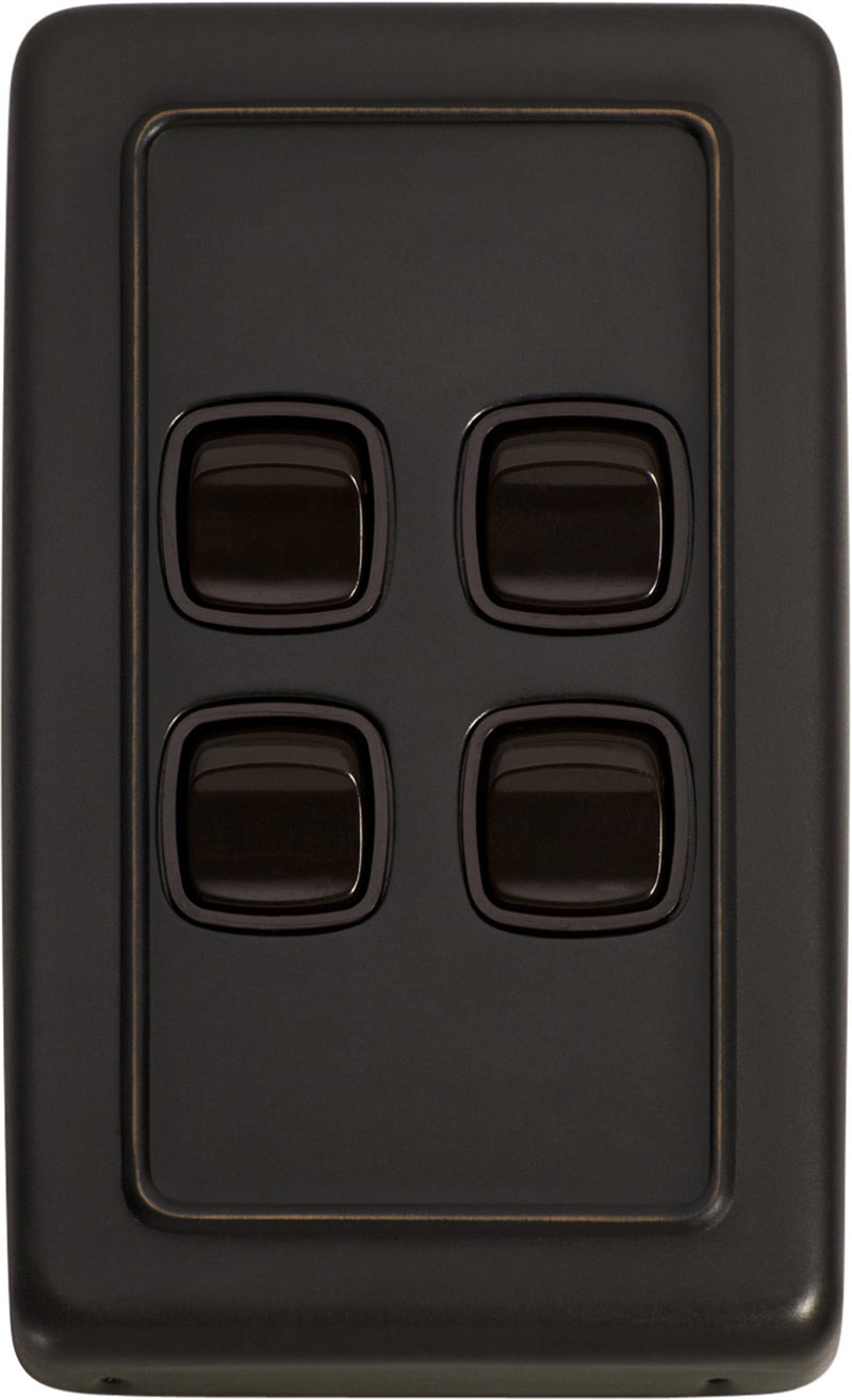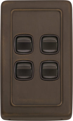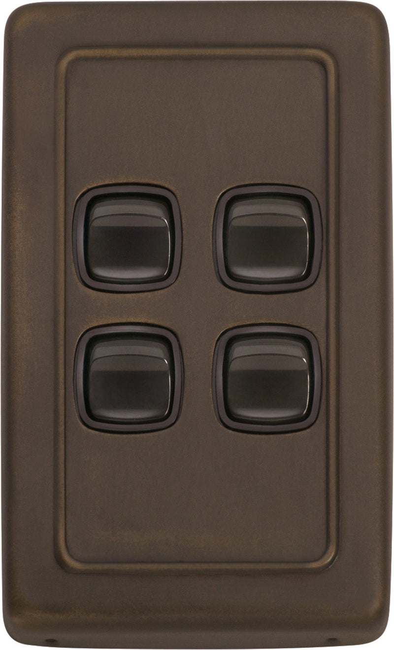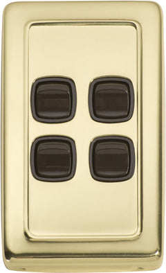 Flat plate 4 gang rocker switches with brass covers and HPM mechanisms. Matching sockets and compatible accessories also available.