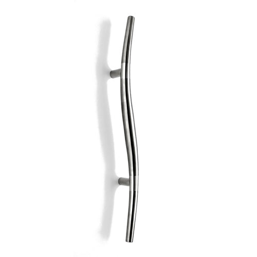 Description: The curvy design of this handle arm, which can be represented by 2 mirroring arcs, is a stylized representation of the popular Art Deco motif. The use of the 2 toned materials is a solution to surface adornment in a modern context. The Arco Pull Handle can sometimes be referred to as a Wave Pull Handle, or a Curved Pull Handle.