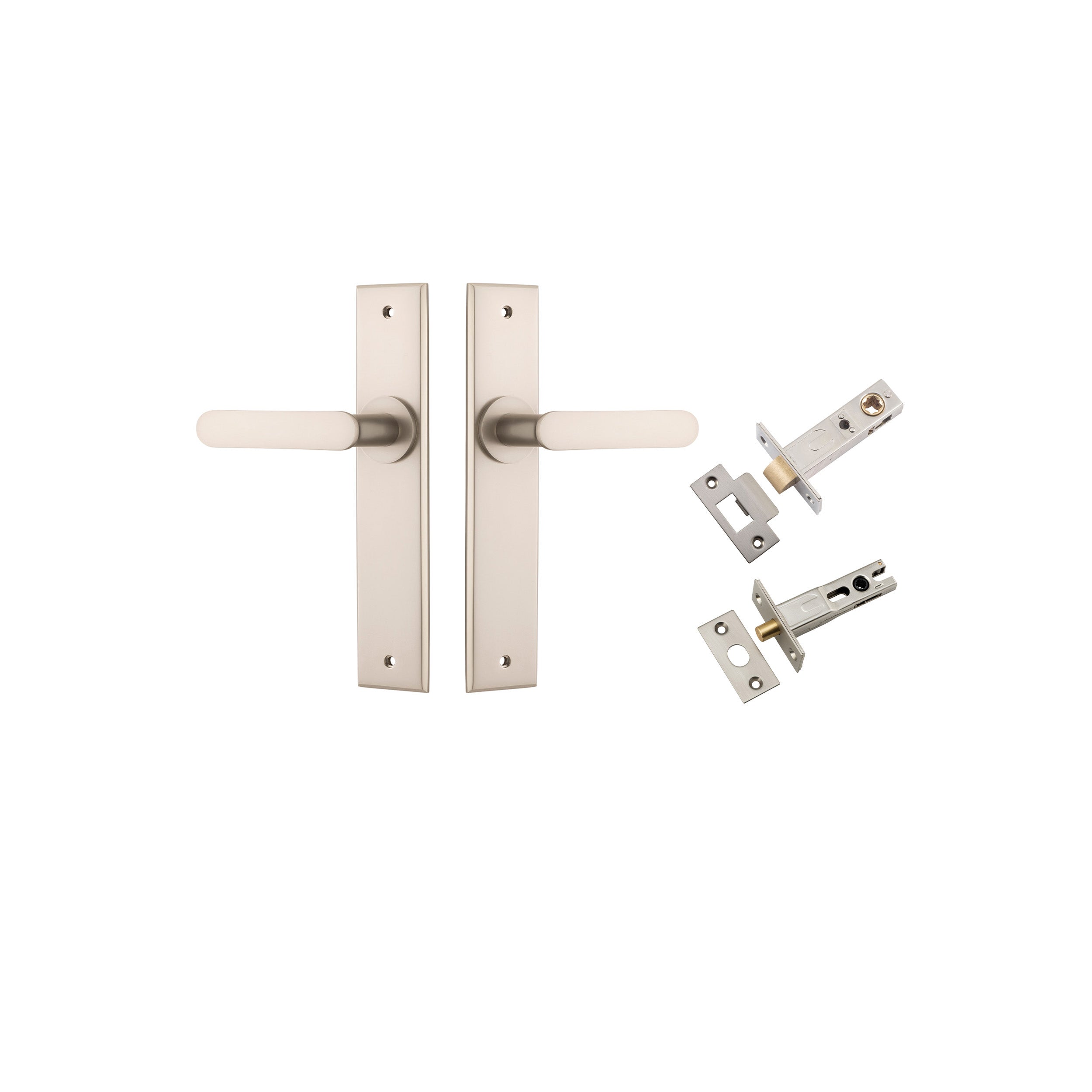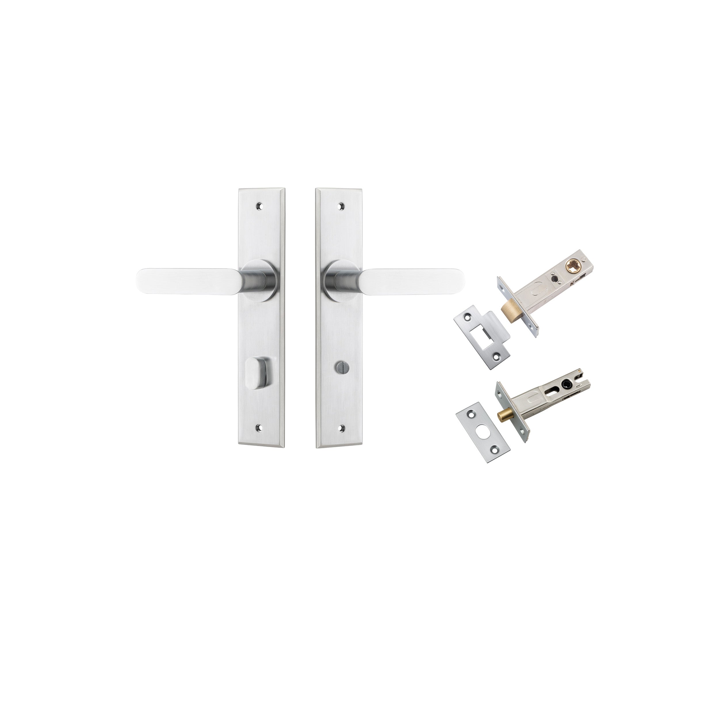 Kit Content: 2 x Bronte Levers on Chamfered Backplate in Signature Brass 1 x Tube Latch Split Cam Backset 60mm 1 x Face Plate 1 x Striker Plate 1 x Privacy Bolt Round Backset 60mm 20 x Screws 2 x Tie Bolts 1 x Standard Spindle 2 x Sprung Spindles 1 x Privacy Adaptor 2 x Dust Boxes 1 x Drill Template 1 x Instruction Manual