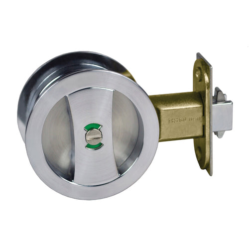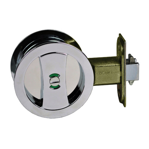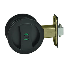 Description: Nidus Cavity Sliding Door Lock Round Privacy Set CSC-PRI-RD-BLV Privacy is used for internal doors that require locking. (e.g. bathrooms, bedrooms, and any room where privacy is needed) Privacy Function - can be locked by a button or a turn piece on the inside with no key function. Features: Edge Pull included Concealed screw fittings Red/Green Indicator