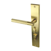 Description: Nidus Domici Knurled LeverLongplate OZI-1 Entrance Set CLP-DOMK-OL-GMG Entrance Lock is defined as a lock that can be unlocked by a key from the outside when the outer knob/lever is locked by a turn button on the inside knob/lever. The inside knob/lever is always unlocked Entrance Lock Function - Outside key unlocks the outside knob/lever, the inside knob/lever is free at all times, push button locks the outside knob/lever Includes: 1 x Domici Knurled Lever on Longplate 1 x Double Cylinder Deadbolt 1 x Nightbolt