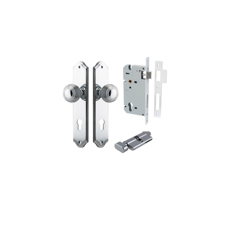 Kit Content: 2 x Levers / Knobs on Backplates of your choice 1 x Euro Mortice Lock CTC85mm Backset 60mm 1 x Face Plate 1 x Striker Plate 1 x Euro Cylinder 5 Pin Dual Function or Key / Thumb 2 x Keys 1 x Standard Spindle 2 x Sprung Spindles 2 x Tie Bolts 18 x Screws 1 x Dust Box 1 x Drill Template 1 x Instruction Manual