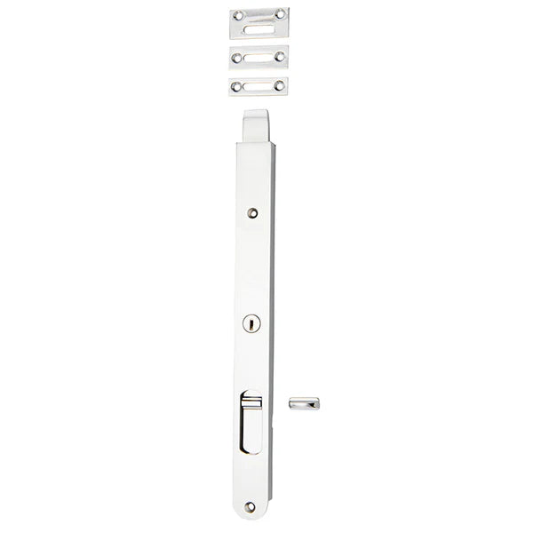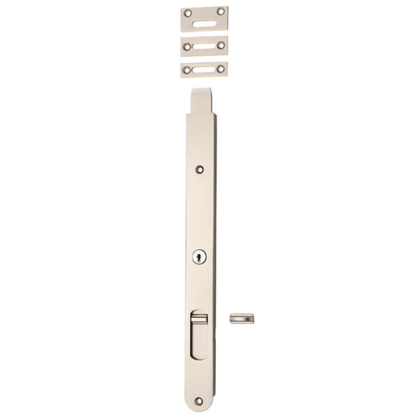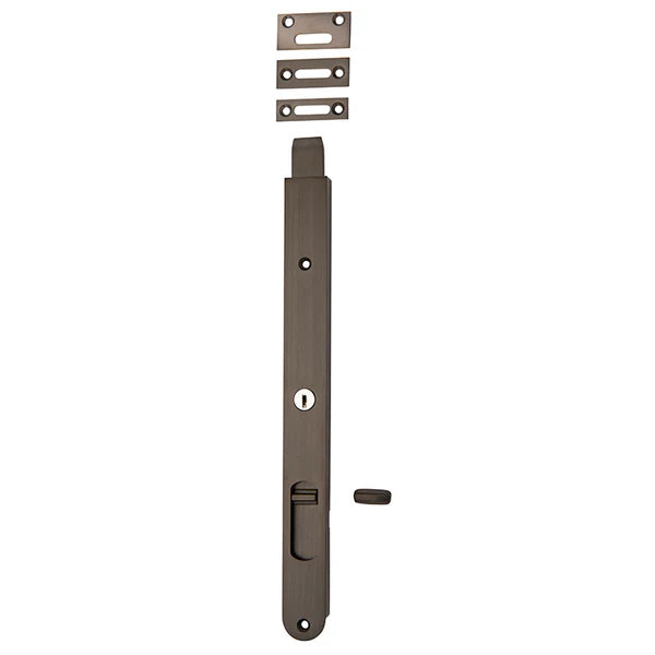 Description: Key operated solid brass locking flush bolt. This product sits flush within a door for a clean, modern look. Bolts can be keyed alike.