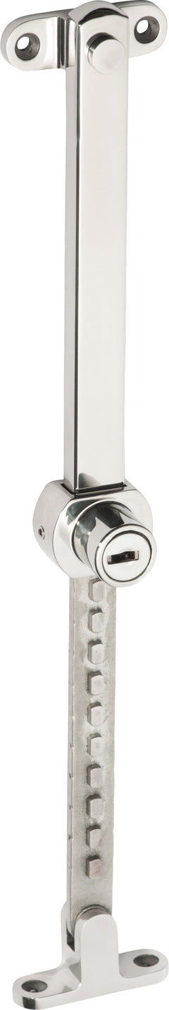 Key operated telescopic casement window fastener. 304 grade stainless steel construction. Can be keyed alike.