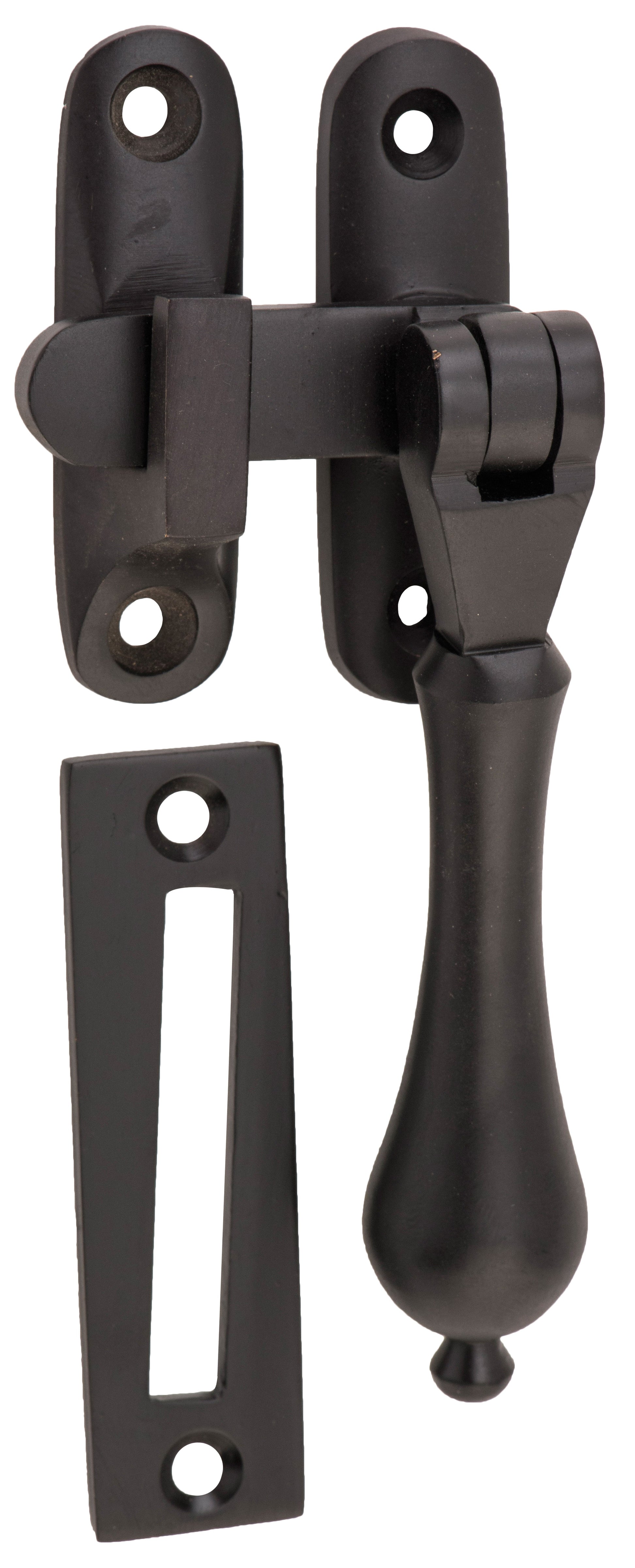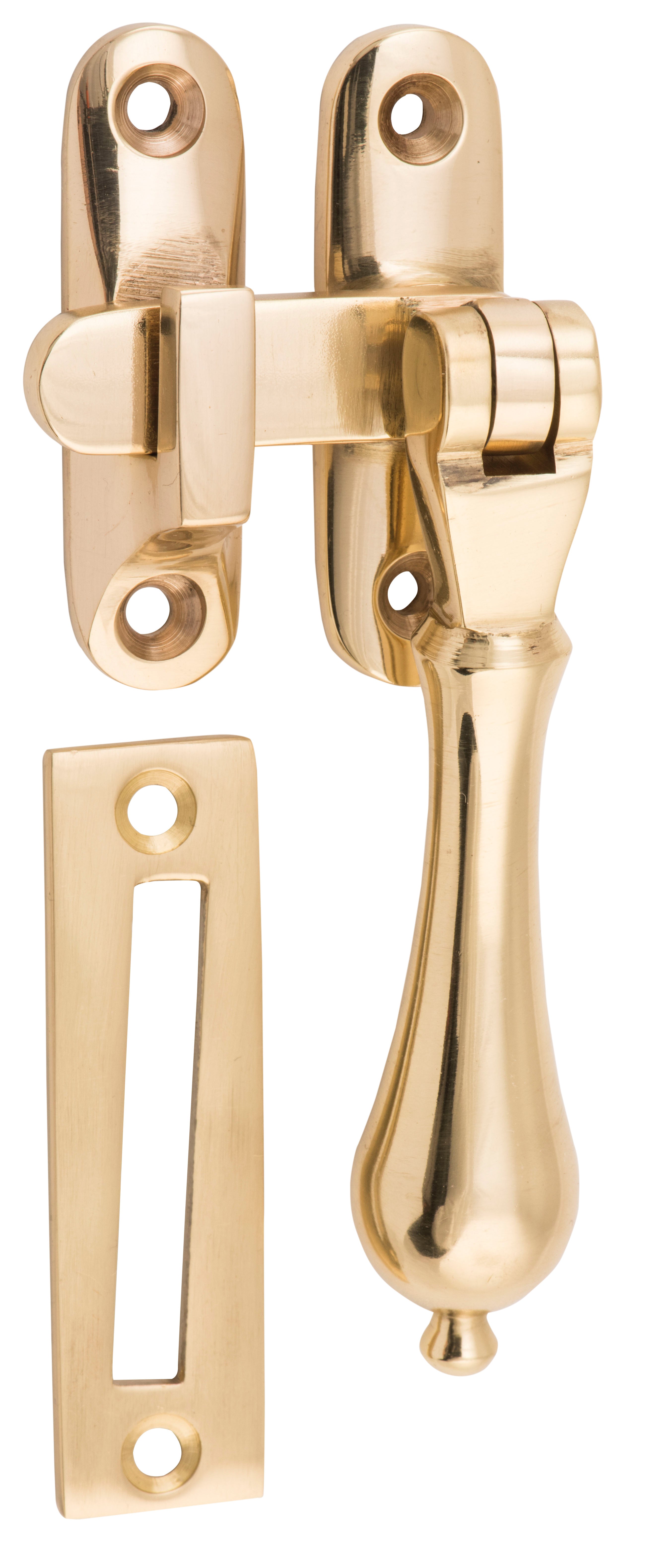 Solid brass teardrop casement fastener with extended tongue for long throw applications.