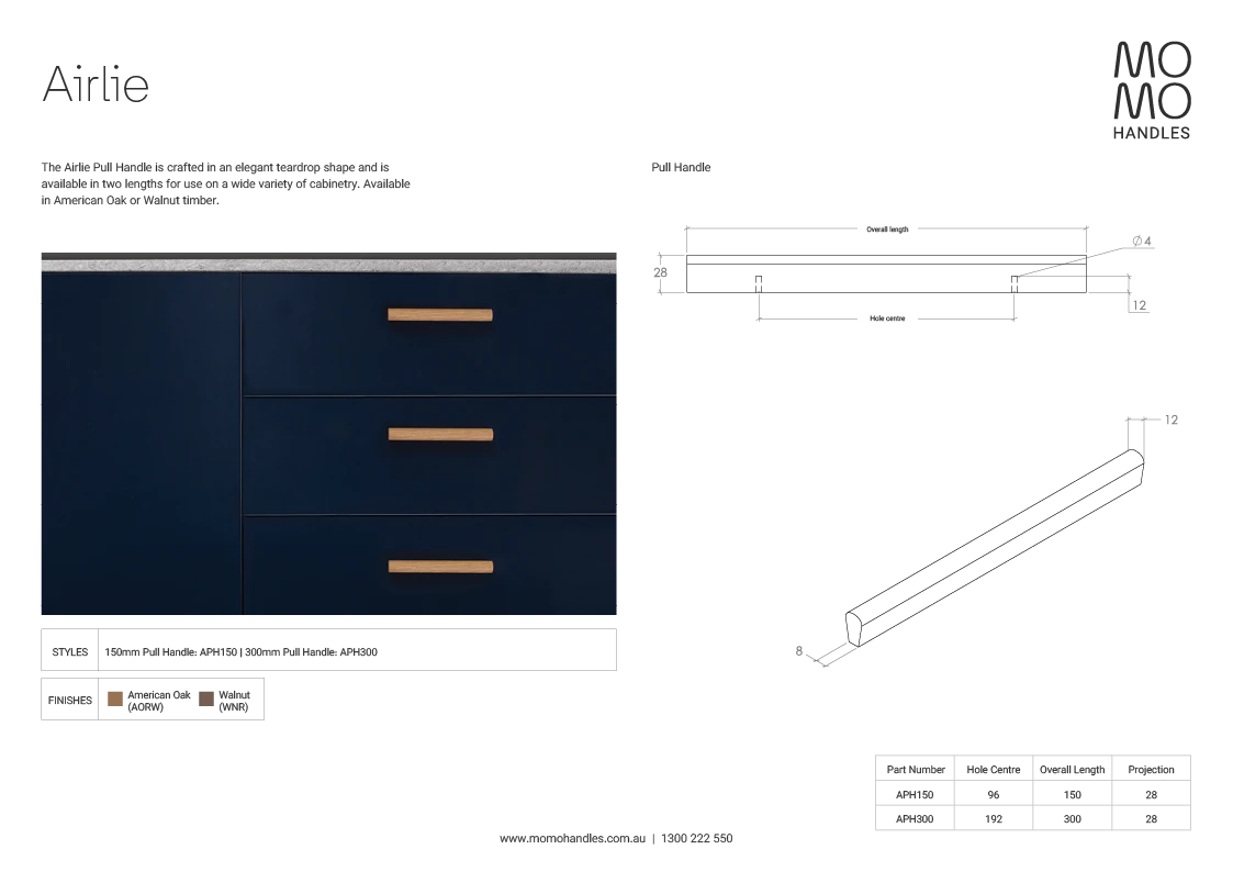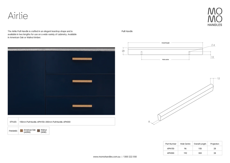 Description: The Airlie Pull Handle is crafted in an elegant teardrop shape and is available in two lengths for use on a wide variety of cabinetry. Available in American Oak or Walnut timber. Highly regarded for its visual appeal, American Oak has an attractive grain that is beautifully highlighted in our stunning range of timber handles. Standard 22mm handle screws included, if a different size is required, please Click here