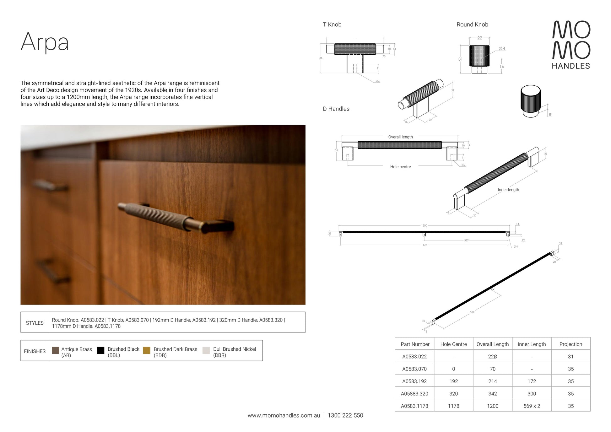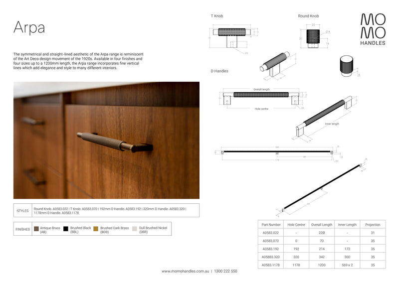 Description: The symmetrical and straight-lined aesthetic of the Arpa range is reminiscent of the Art Deco design movement of the 1920s. Available in four finishes and four sizes up to a 1200mm length, the Arpa range incorporates fine vertical lines which add elegance and style to many different interiors. Material: Aluminium Standard 22mm handle screws included, if a different size is required, please Click here