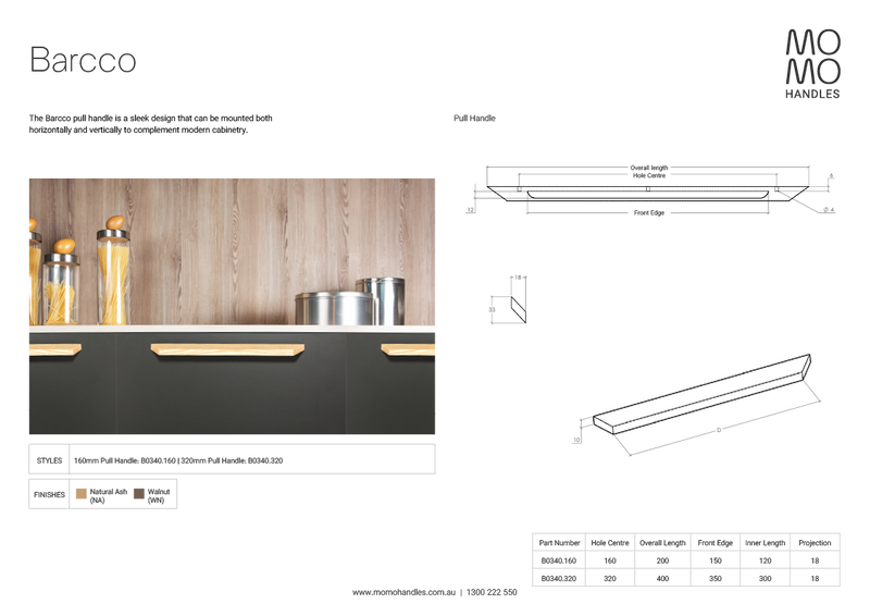 Description: The Barcco pull handle is a sleek design that can be mounted both horizontally and vertically to complement modern cabinetry. Material: Ash Timber Standard 22mm handle screws included, if a different size is required, please Click here