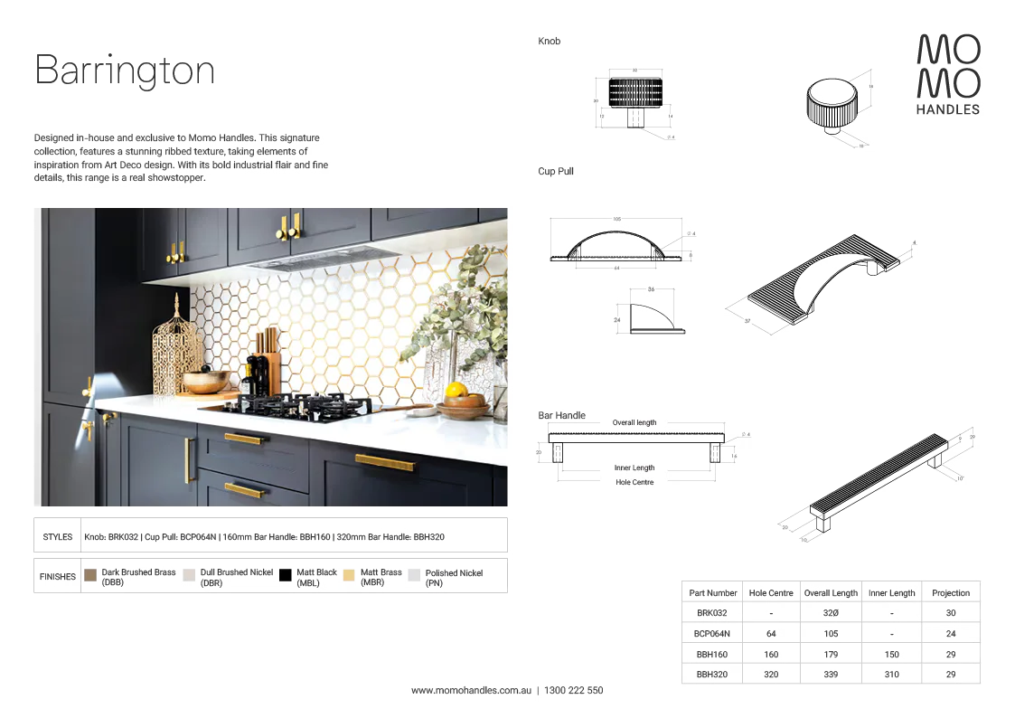 Description: Designed in-house and exclusive to Momo Handles. This signature collection features a stunning ribbed texture, taking elements of inspiration from Art Deco design. With its bold industrial flair and fine details, this range is a real showstopper. The Barrington Backplate is optional; however it can be used in conjunction with the 160mm Barrington Bar Handle to create an impressive aesthetic. Material: Zinc Alloy. Standard 22mm handle screws included, if a different size is required, please Click here
