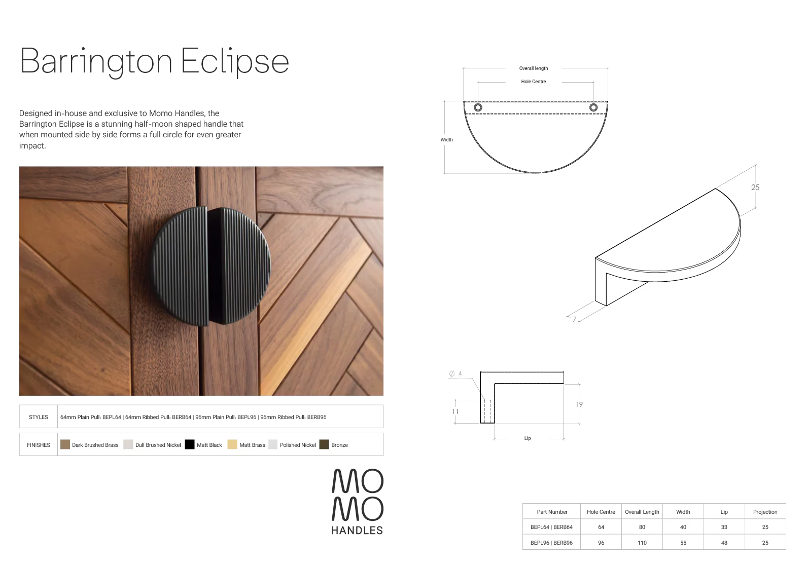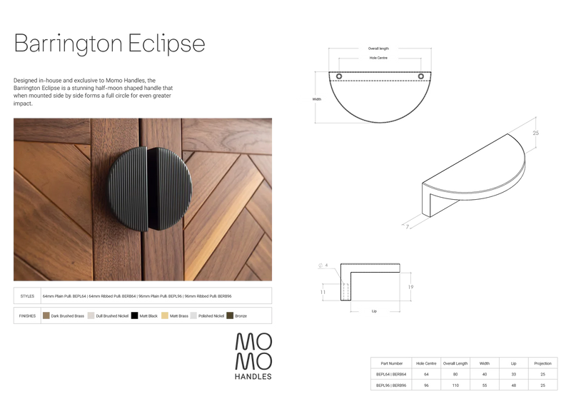 Description: Designed in-house and exclusive to Momo Handles, the Barrington Eclipse is a stunning half-moon shaped handle that when mounted side by side forms a full circle for even greater impact. Material: Zinc Alloy. Standard 22mm handle screws included.