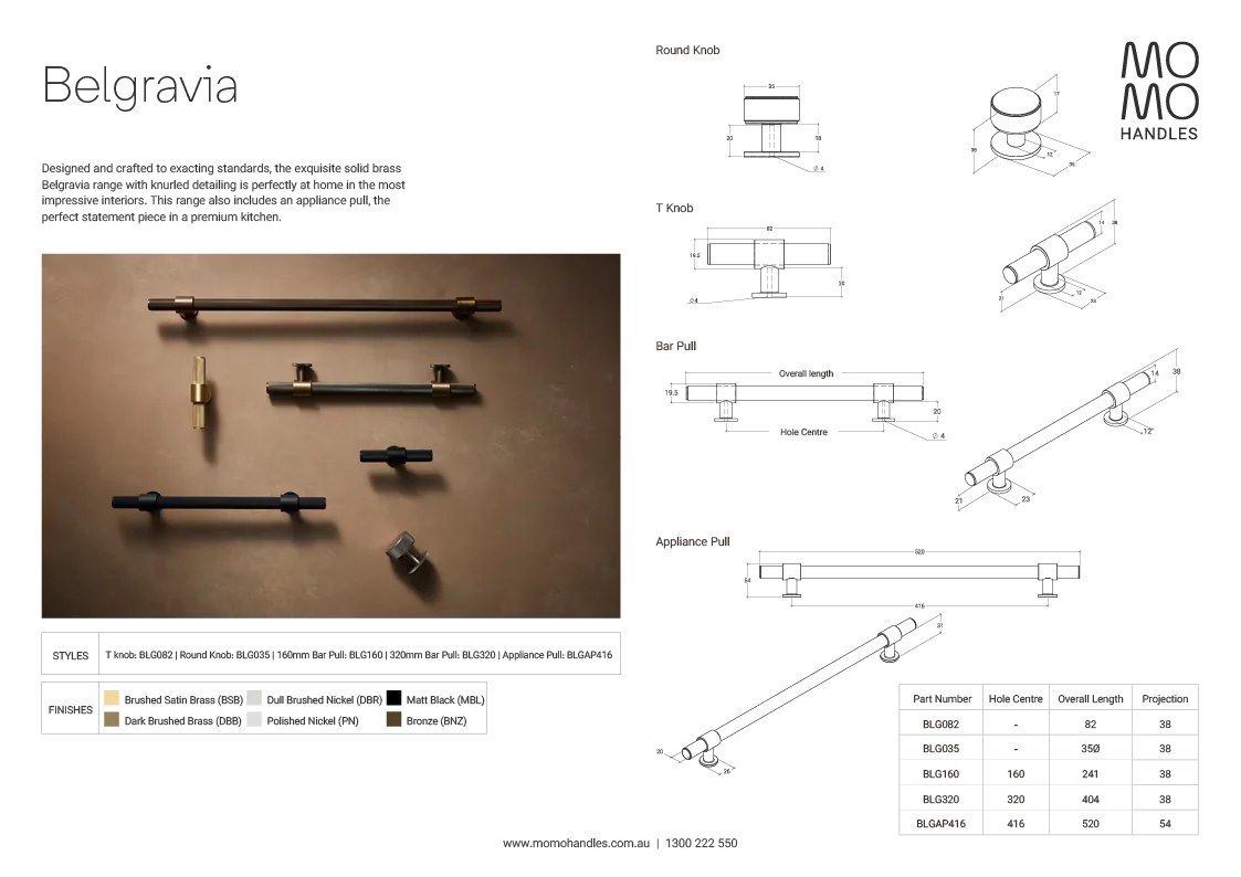 Description: Designed and crafted to exacting standards, the exquisite solid brass Belgravia range with knurled detailing is perfectly at home in the most impressive interiors. This range also includes an appliance pull, the perfect statement piece in a premium kitchen. Material: Solid Brass. Standard 22mm handle screws included, if a different size is required, please Click here