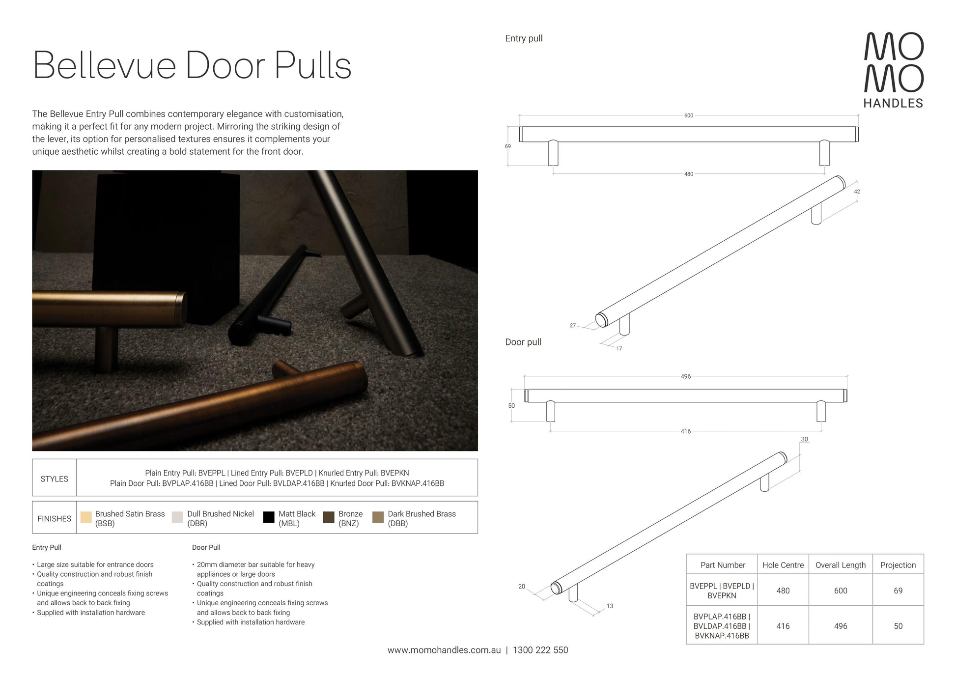 Description: The Bellevue Entry Pull combines contemporary elegance with customization, making it a perfect fit for any modern project. Mirroring the striking design of the lever, its option for personalized textures ensures it complements your unique aesthetic while creating a bold statement for the front door. Manufactured from solid brass Large size suitable for entrance doors Quality construction and robust finish coatings Unique engineering conceals fixing screws and allows back-to-back fixing Supplied with installation hardware