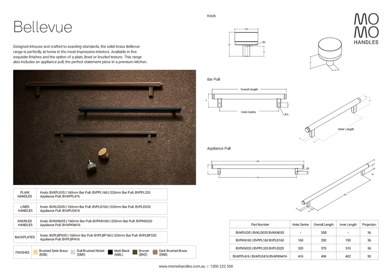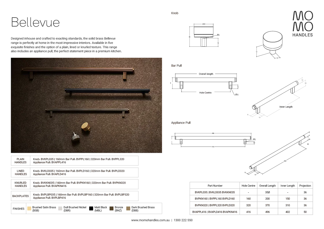 Description: Designed inhouse and crafted to exacting standards, the solid brass Bellevue range is perfectly at home in the most impressive interiors. Available in five exquisite finishes and the option of a plain, lined or knurled texture. This range also includes an appliance pull, the perfect statement piece in a premium kitchen. Material: Solid Brass. Standard 22mm handle screws included, if a different size is required, please Click here. Appliance Pull comes with required screws.