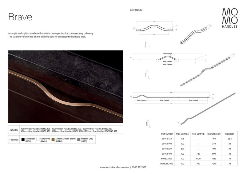 Description: A simple and stylish handle with a subtle curve perfect for contemporary cabinetry. The 992mm version has an off-centred bow for an elegantly dramatic look. Standard 22mm handle screws included. Due to the slim design of the Brave handle, the thread depth is approx. 4mm. Please allow for a shorter screw for installation.