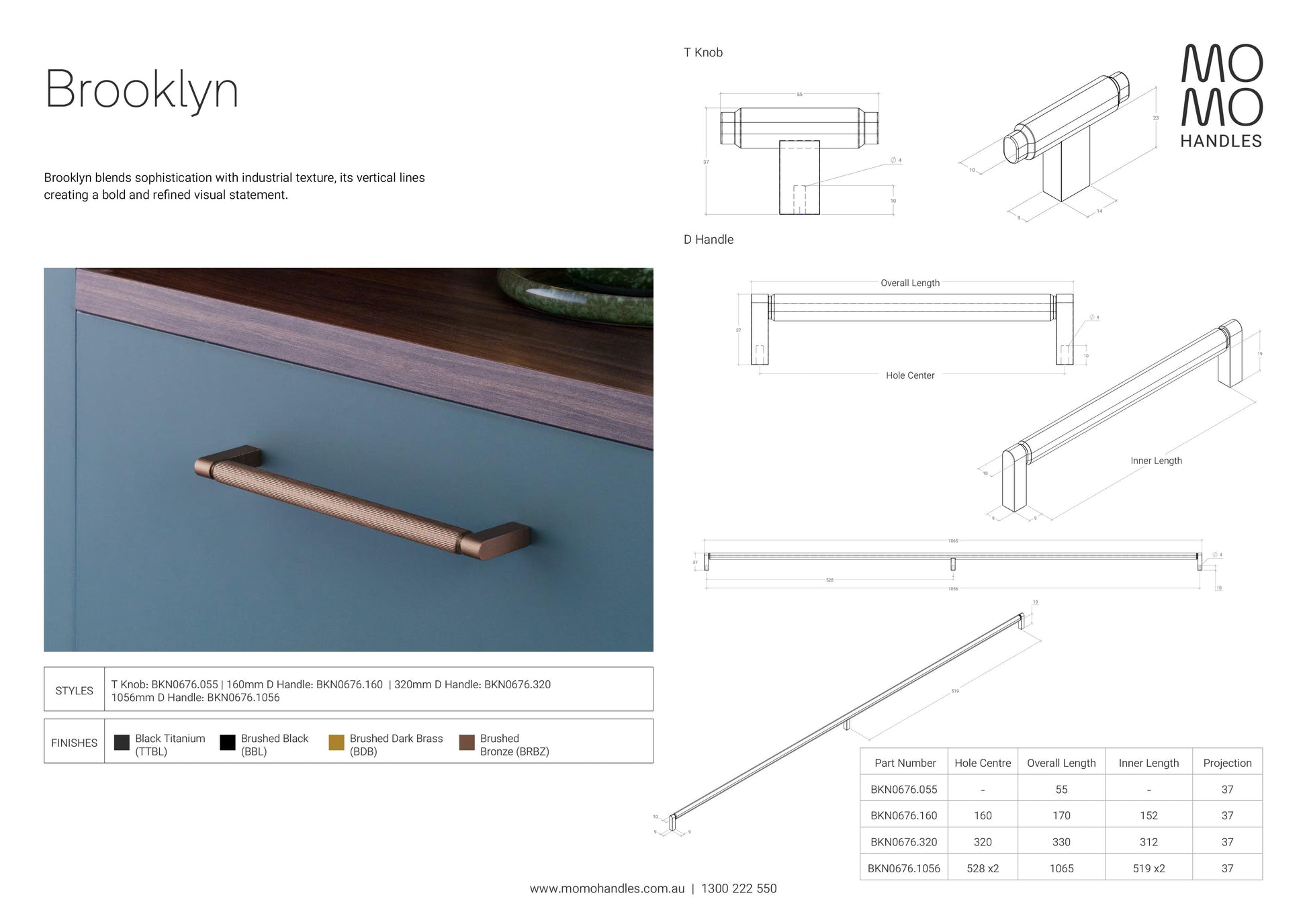 Description: Brooklyn blends sophistication with industrial texture, its vertical lines creating a bold and refined visual statement. Standard 22mm handle screws included, if a different size is required