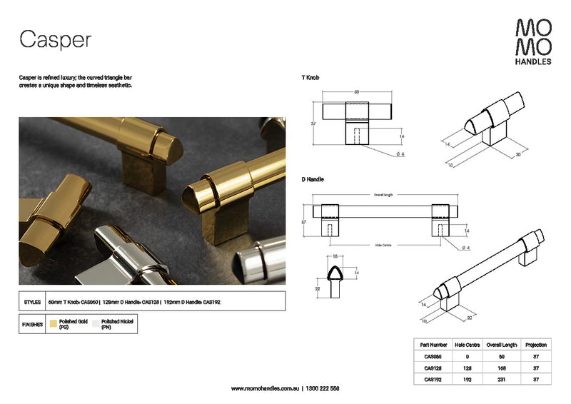 Description: Casper is refined luxury; the curved triangle bar creates a unique shape and timeless aesthetic. Material: Aluminium Standard 22mm handle screws included, if a different size is required, please Click here.