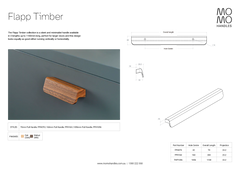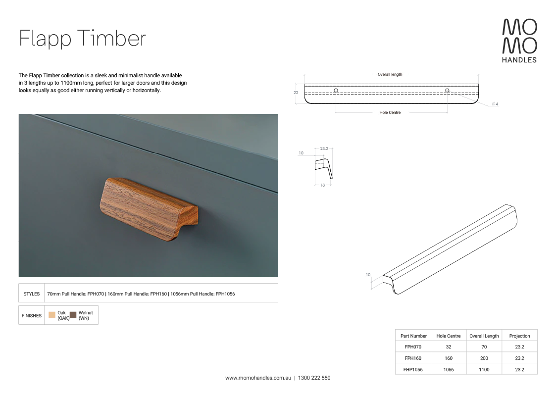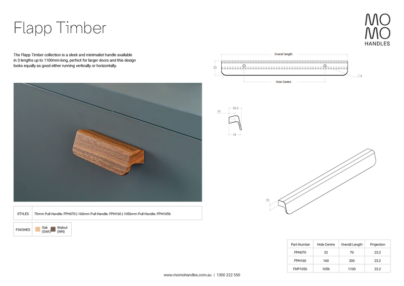 Description: The Flapp Timber collection is a sleek and minimalist handle available in 3 lengths up to 1100mm long, perfect for larger doors and this design looks equally as good either running vertically or horizontally. Material: Wood Standard 22mm handle screws included, if a different size is required