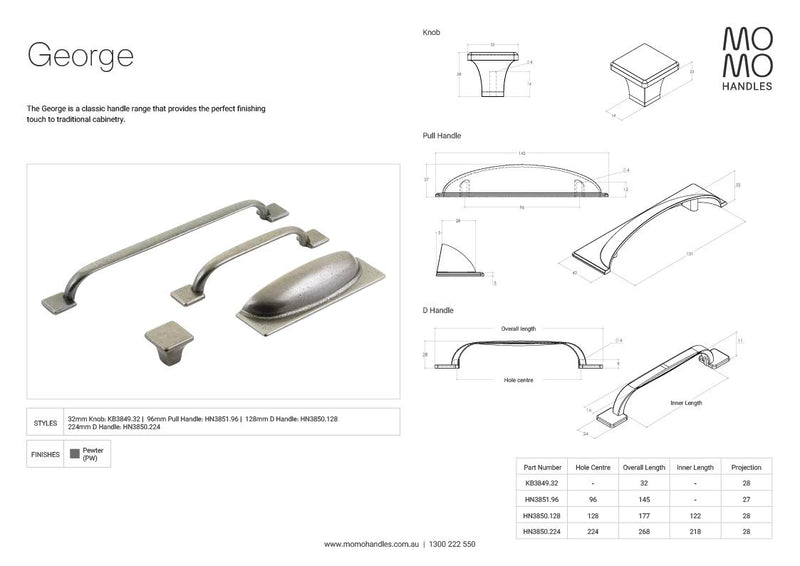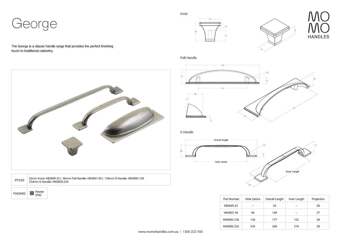 Description: The George is a classic handle range that provides the perfect finishing touch to traditional cabinetry. Material: Cast Iron Standard 22mm handle screws included.