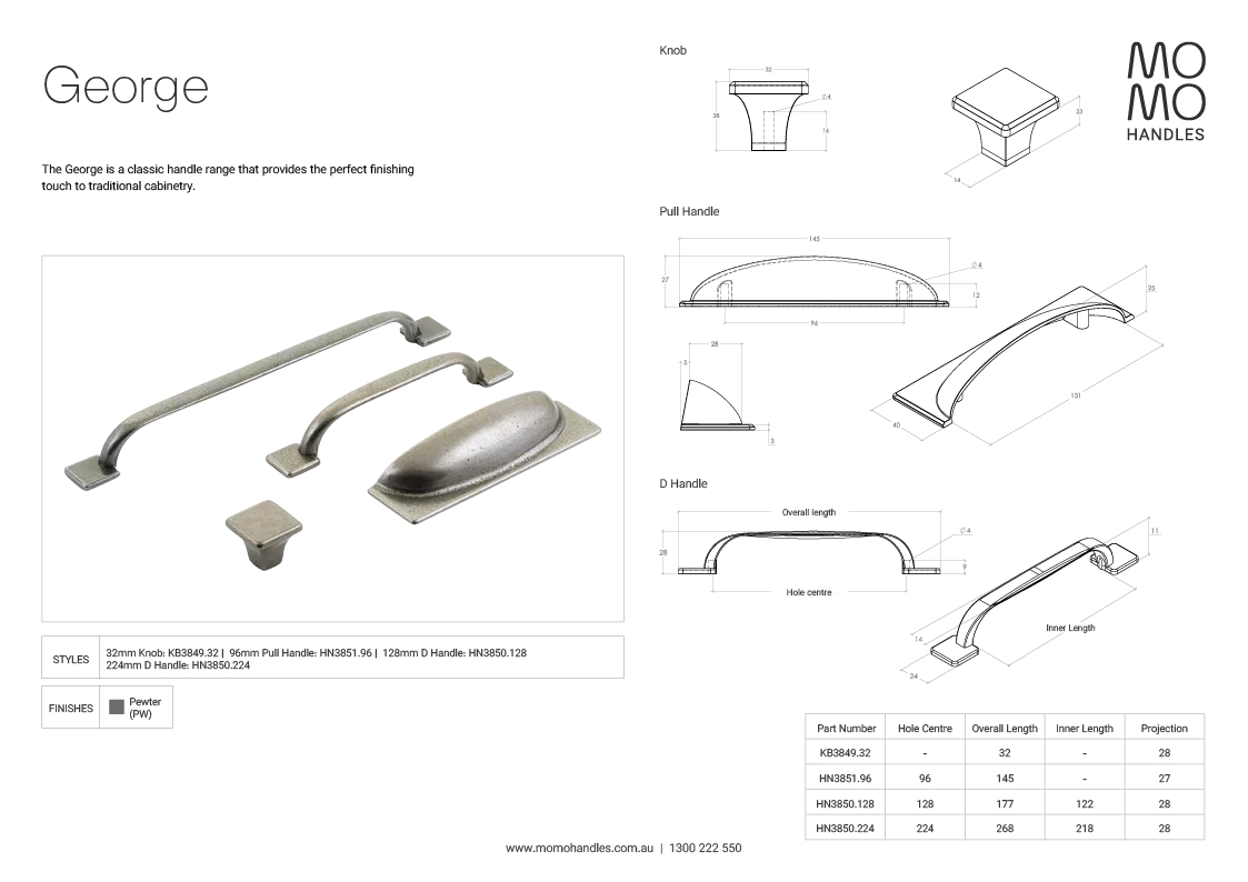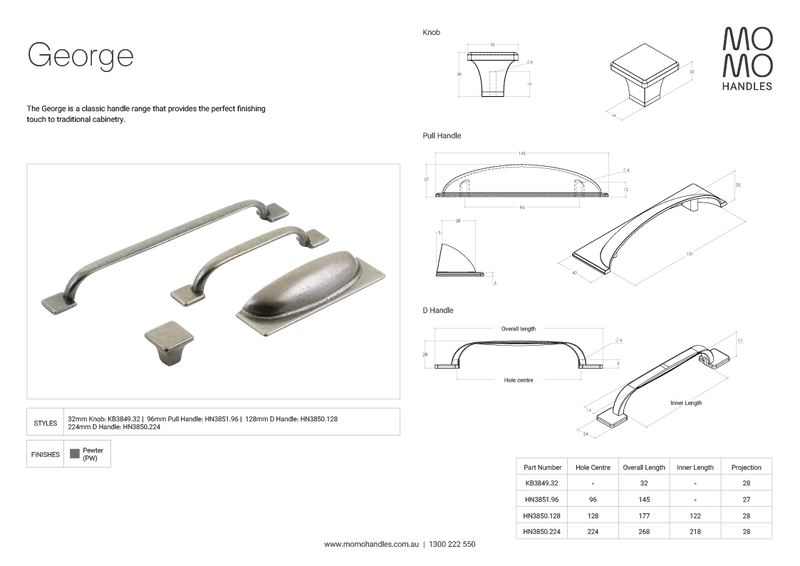 Description: The George is a classic handle range that provides the perfect finishing touch to traditional cabinetry. Material: Cast Iron Standard 22mm handle screws included, if a different size is required.