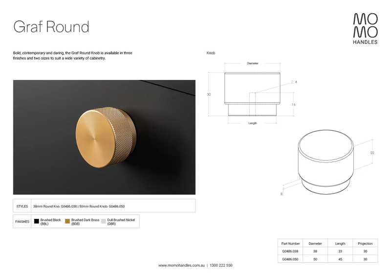 Description: Bold, contemporary and daring, the Graf Round Knob is available in three finishes and two sizes to suit a wide variety of cabinetry. Material: Aluminium Standard 22mm handle screws included, if a different size is required