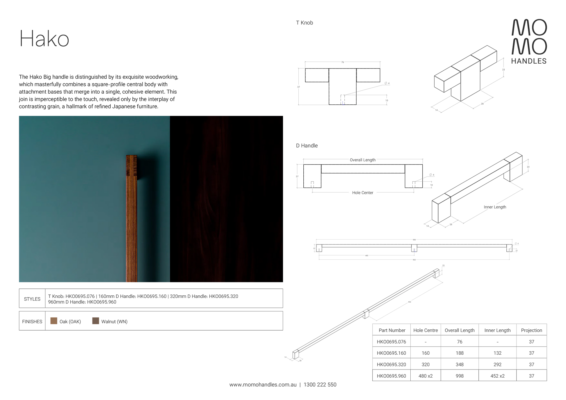 Description: The Hako handle is distinguished by its exquisite woodworking, which masterfully combines a square-profile central body with attachment bases that merge into a single, cohesive element. This join is imperceptible to the touch, revealed only by the interplay of contrasting grain, a hallmark of refined Japanese furniture. These handles should be mounted using a screwdriver, not a battery drill.