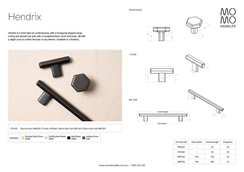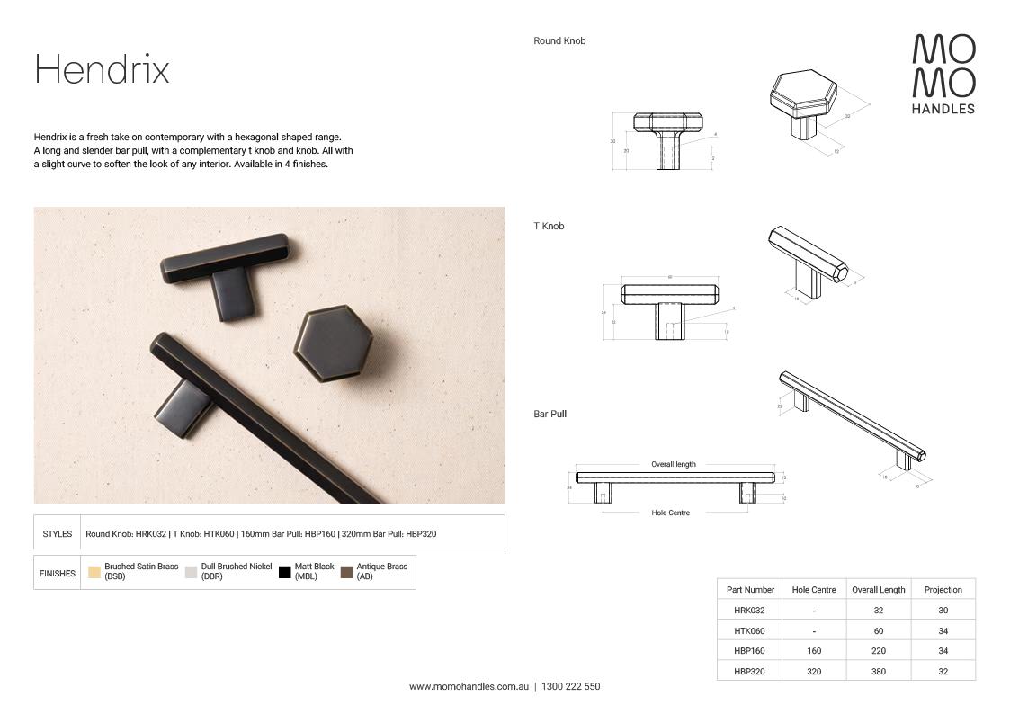 Description: Hendrix is a fresh take on contemporary with a hexagonal shaped range. A long and slender bar pull, with a complementary t knob and knob. All with a slight curve to soften the look of any interior. Available in 4 finishes. Material: Zinc Alloy. Standard 22mm handle screws included, if a different size is required.