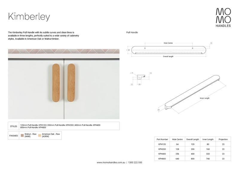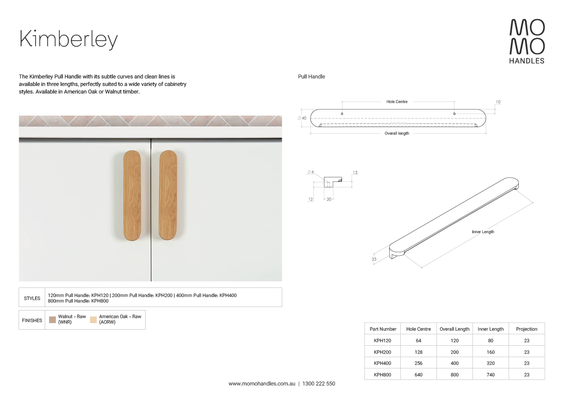 Description: The Kimberley Pull Handle with its subtle curves and clean lines is available in three lengths, perfectly suited to a wide variety of cabinetry styles. Available in American Oak or Walnut timber. Highly regarded for its visual appeal, American Oak has an attractive grain that is beautifully highlighted in our stunning range of timber handles.