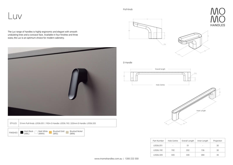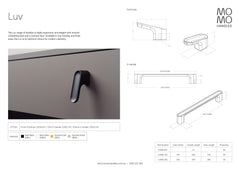 Description: The Luv range of handles is highly ergonomic and elegant with smooth undulating lines and a concave face. Available in four finishes and three sizes, the Luv is an optimum choice for modern cabinetry. Material: Zinc Alloy Standard 22mm handle screws included, if a different size is required