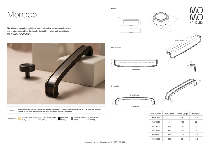 Description: The Monaco range is a stylish take on minimalism with rounded corners and a raised edge along the handle. Comes in a bar pull, round knob and d handle for versatility. Available in 5 finishes. Material: Zinc Alloy. Standard 22mm handle screws included, if a different size is required
