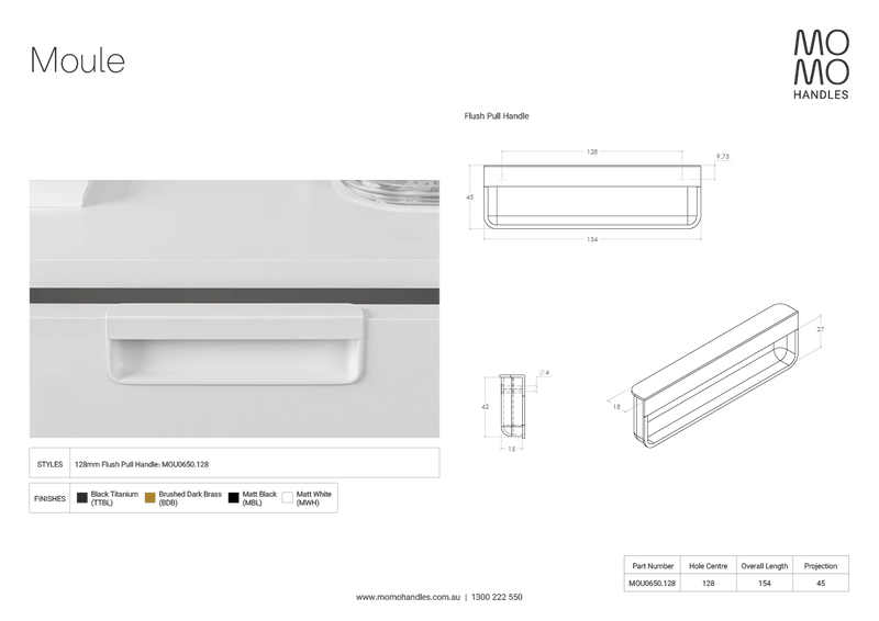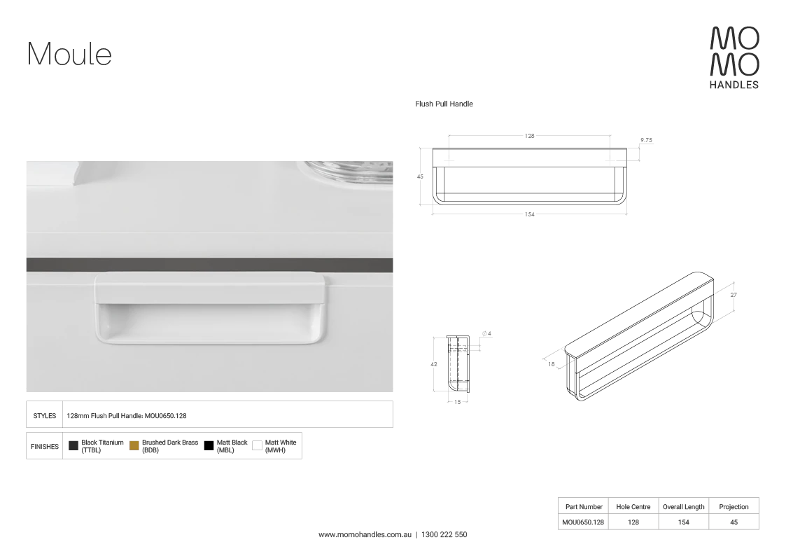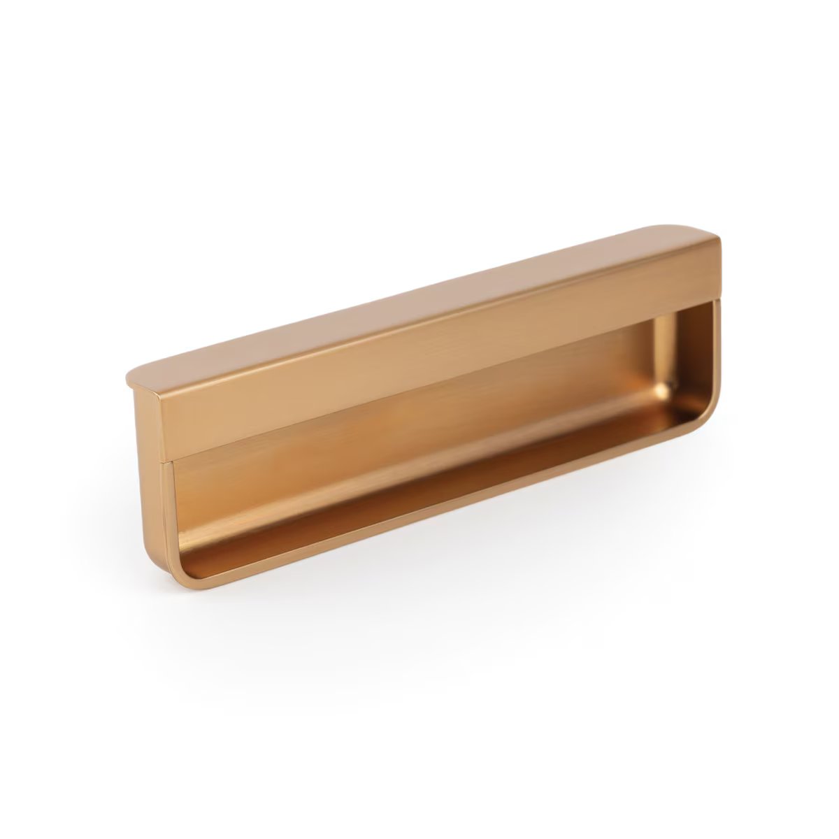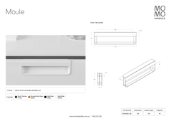 Description: Moule is an elegant recessed flush pull featuring a lip detail to add a distinct personality and style to its surroundings. Moule is available in five finishes and can be installed horizontally or vertically. Material: Zinc Alloy Standard 22mm handle screws included.