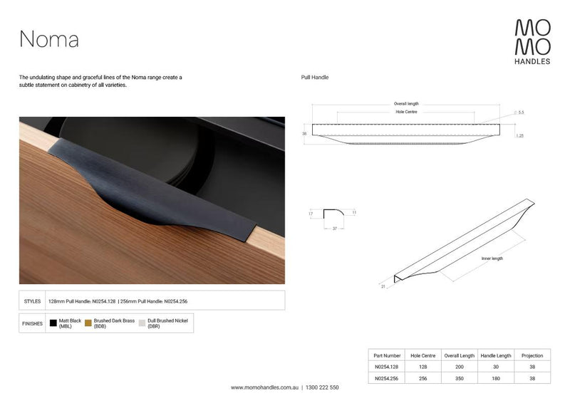 Description: The undulating shape and graceful lines of the Noma range create a subtle statement on cabinetry of all varieties. Material: Aluminium. Standard 22mm handle screws included, if a different size is required