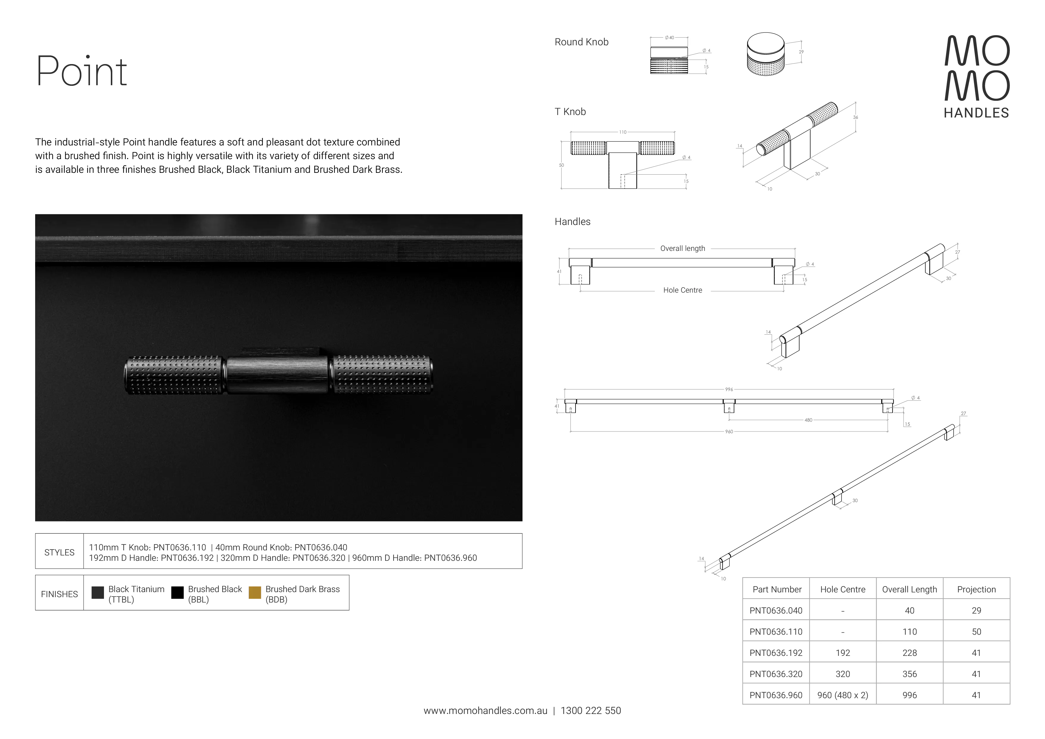 Description: The industrial-style Point handle features a soft and pleasant dot texture combined with a brushed finish. Point is highly versatile with its variety of different sizes and is available in three finishes Brushed Black, Black Titanium and Brushed Dark Brass. Material: Aluminium Standard 22mm handle screws included, if a different size is required, please Click here