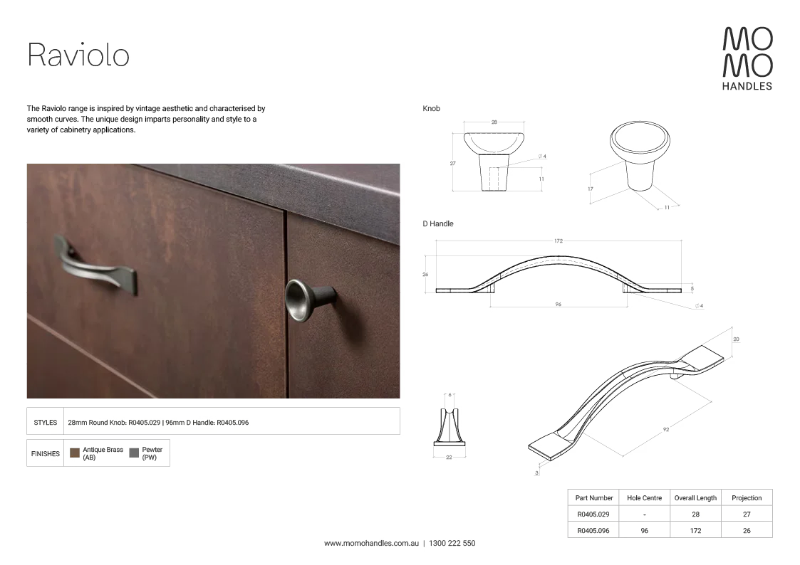 Description: The Raviolo range is inspired by vintage aesthetic and characterised by smooth curves. The unique design imparts personality and style to a variety of cabinetry applications. Material: Zinc Alloy Standard 22mm handle screws included, if a different size is required, please Click here