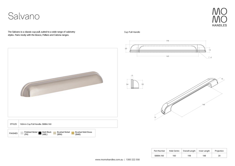 Description: The Salvano is a classic cup pull, suited to a wide range of cabinetry styles. Pairs nicely with the Bosco, Pellaro and Catona ranges. Material: Aluminium Standard 22mm handle screws included, if a different size is required