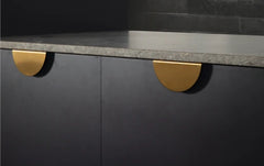 Description: The Sola lip pull handle is a bold and striking half-moon shape that perfectly complements contemporary cabinetry. A full circle is formed when mounted side-by-side for an even greater statement. Available in four sizes and four finishes, this handle simply wraps over the cabinetry and attaches with two screws at the rear. Material: Stainless Steel Supplied with 16mm countersunk screws with heads finished to match