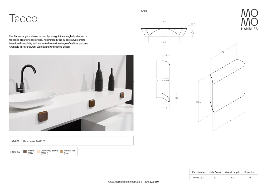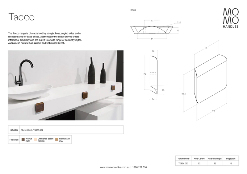 Description: The Tacco range is characterised by straight lines, angled sides and a recessed area for ease of use. Aesthetically the subtle curves create intentional simplicity and are suited to a wide range of cabinetry styles. Available in Natural Ash, Walnut and Unfinished Beech. Material: Timber Standard 22mm handle screws included, if a different size is required
