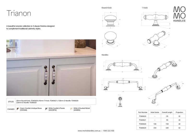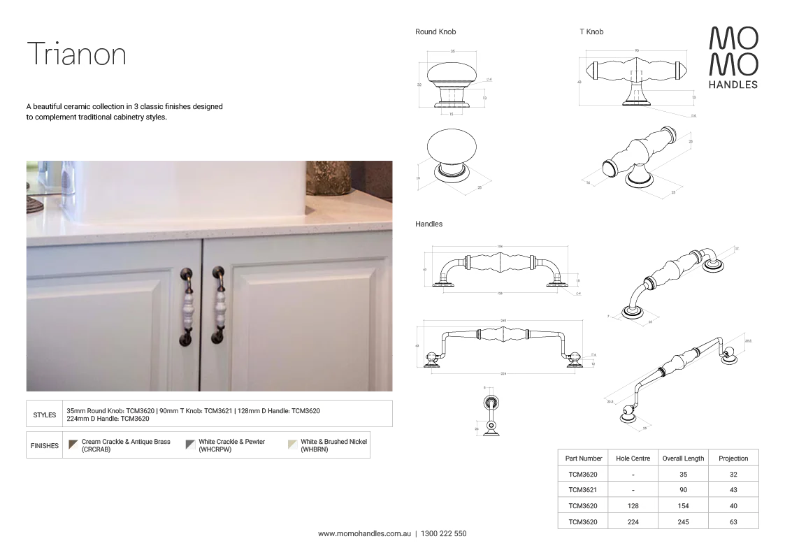 Description: A beautiful ceramic collection in 3 classic finishes designed to complement traditional cabinetry styles. Material: Ceramic and Zinc Alloy Standard 22mm handle screws included, if a different size is required