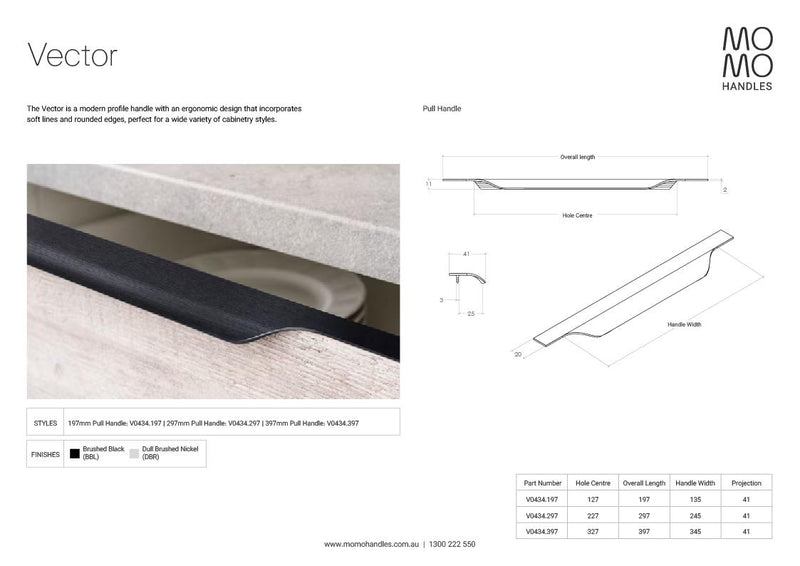 Description: The Vector is a modern profile handle with an ergonomic design that incorporates soft lines and rounded edges, perfect for a wide variety of cabinetry styles. PLEASE NOTE: This handle requires routing into the top of the door or drawer panel. Material: Aluminium
