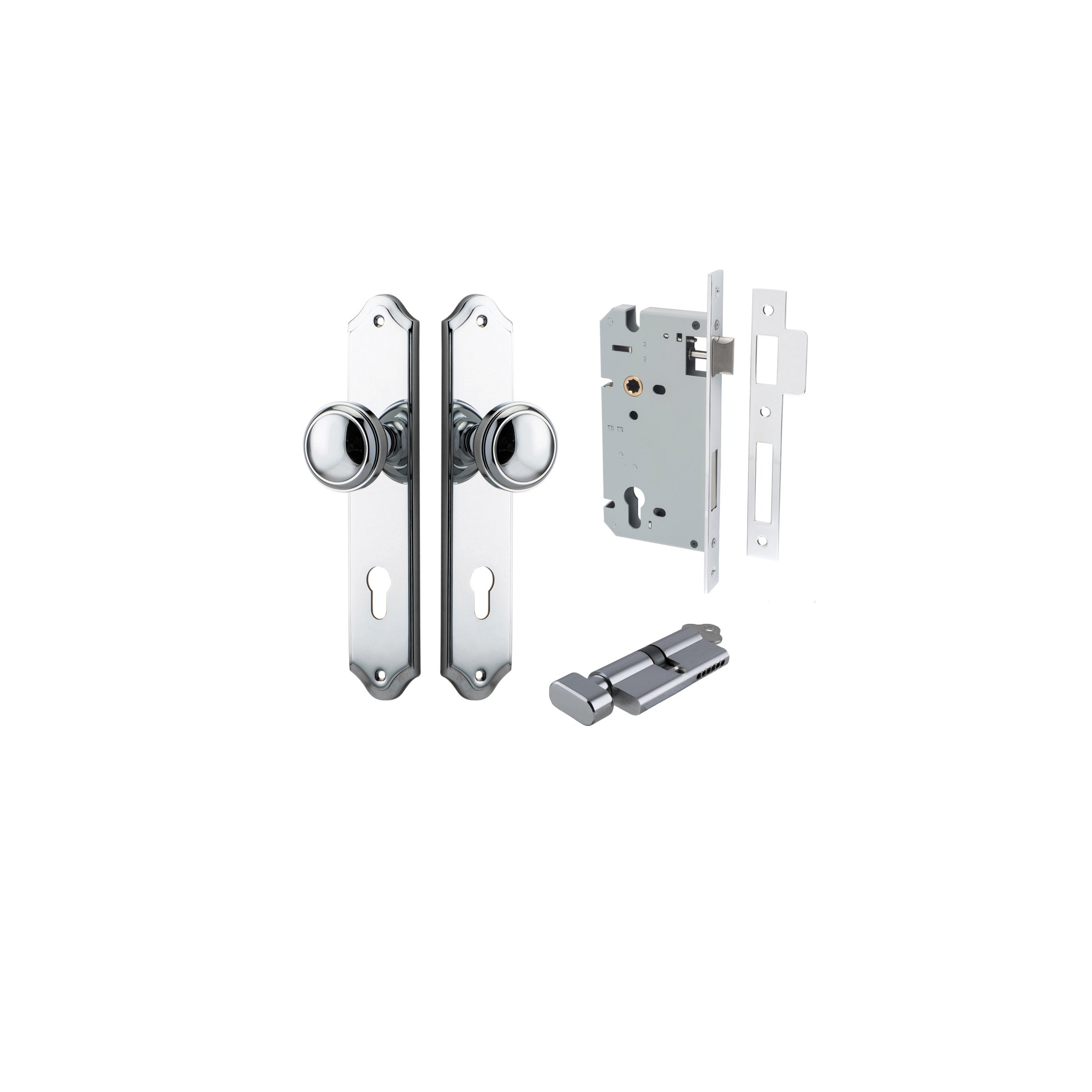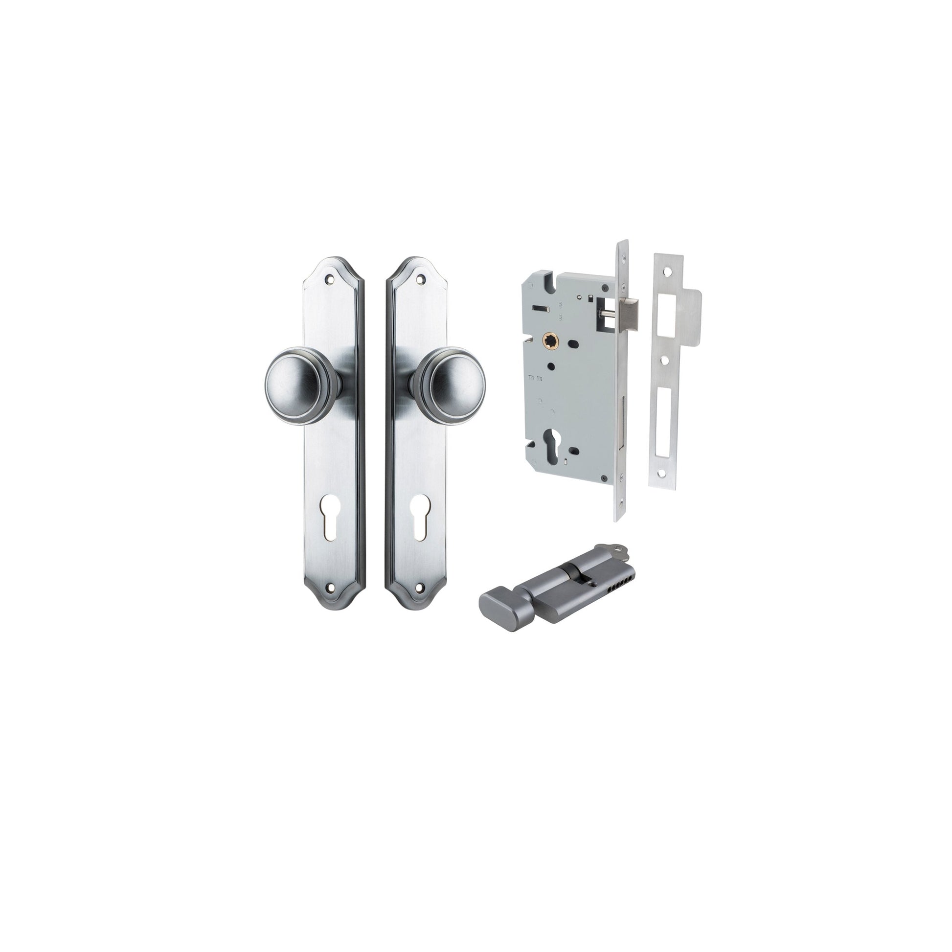 Kit Content: 2 x Levers / Knobs on Backplates of your choice 1 x Euro Mortice Lock CTC85mm Backset 60mm 1 x Face Plate 1 x Striker Plate 1 x Euro Cylinder 5 Pin Dual Function or Key / Thumb 2 x Keys 1 x Standard Spindle 2 x Sprung Spindles 2 x Tie Bolts 18 x Screws 1 x Dust Box 1 x Drill Template 1 x Instruction Manual