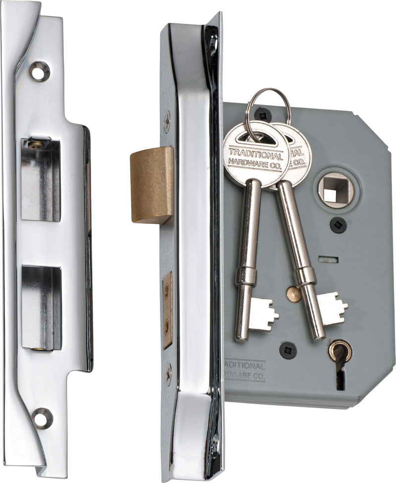 Rebated 5 lever high security mortice lock for external applications.
