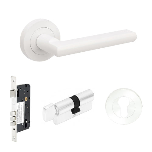 Specifications: Backset: 60mm Finish: Matt White Door Function: Entrance Set 70mm Cylinder (Key/Turn) Zanda Leverset Kits With this listing, by answering a couple of short questions, you can create a kit customised to your needs: This listing includes premade kits to suit standard applications.