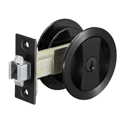 Description: Zanda Round Cavity Sliding Lockable Set 5335.BLK Sliding Door Mortice lock is a type of lock that is installed into the edge of a door. It can be operated by key or snib Sliding Door Mortice lock Function - often used for perimiter sliding doors, as it allows the user to lock the door from the inside and prevent unauthorized access from the outside. Features: Flush turn design allows door to slide right back into the cavity Includes instructions for quick and easy installation Complimentary edge pull included with every kit