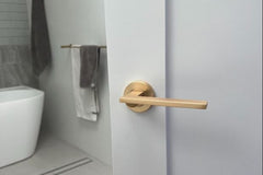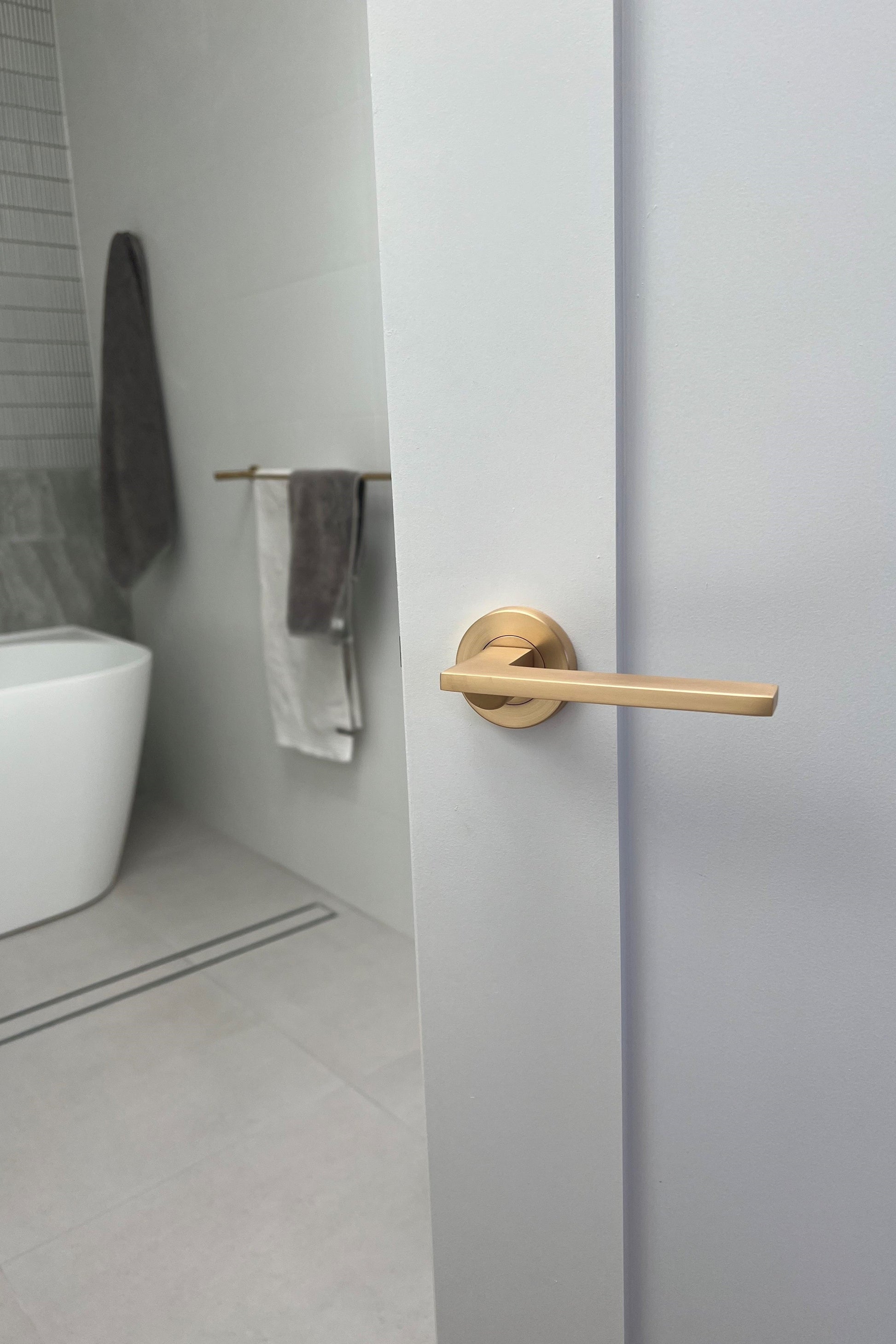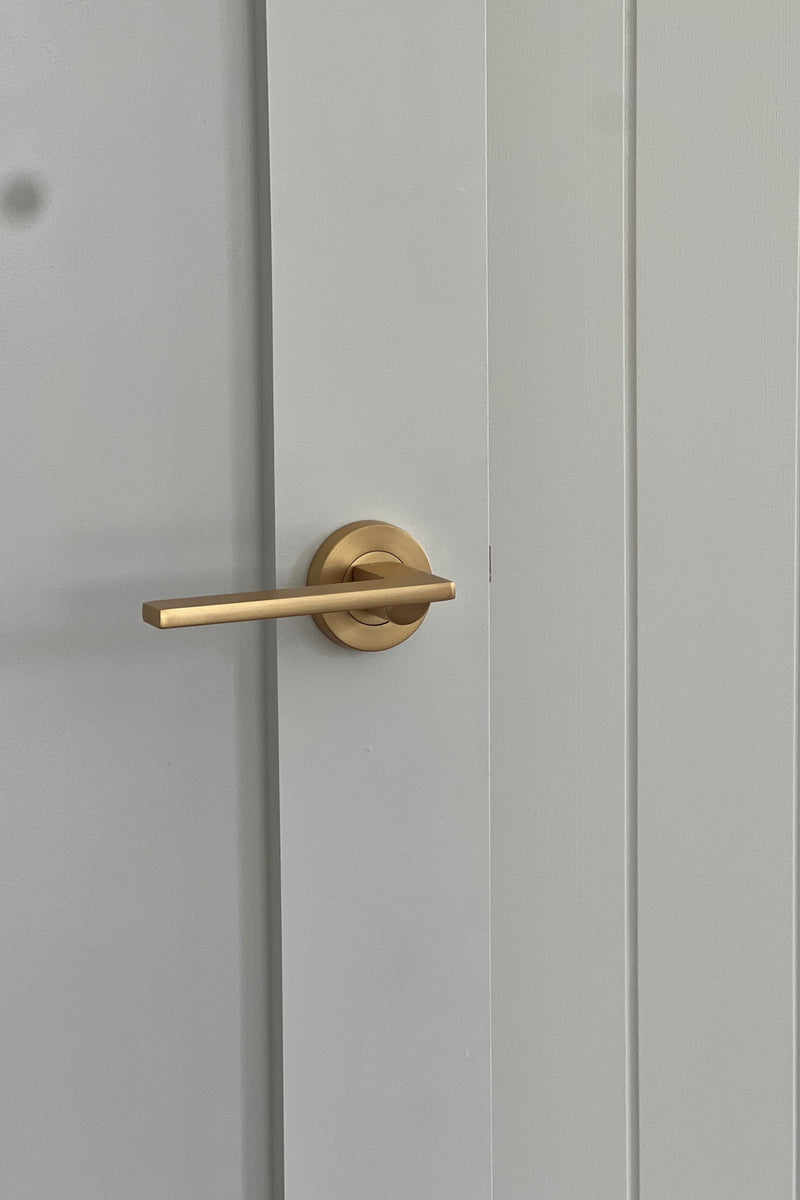 This Satin Brass Door Handle fits into many different designs of homes including transitional, that Hollywood glam vibe and even crossing into mid-century modern.