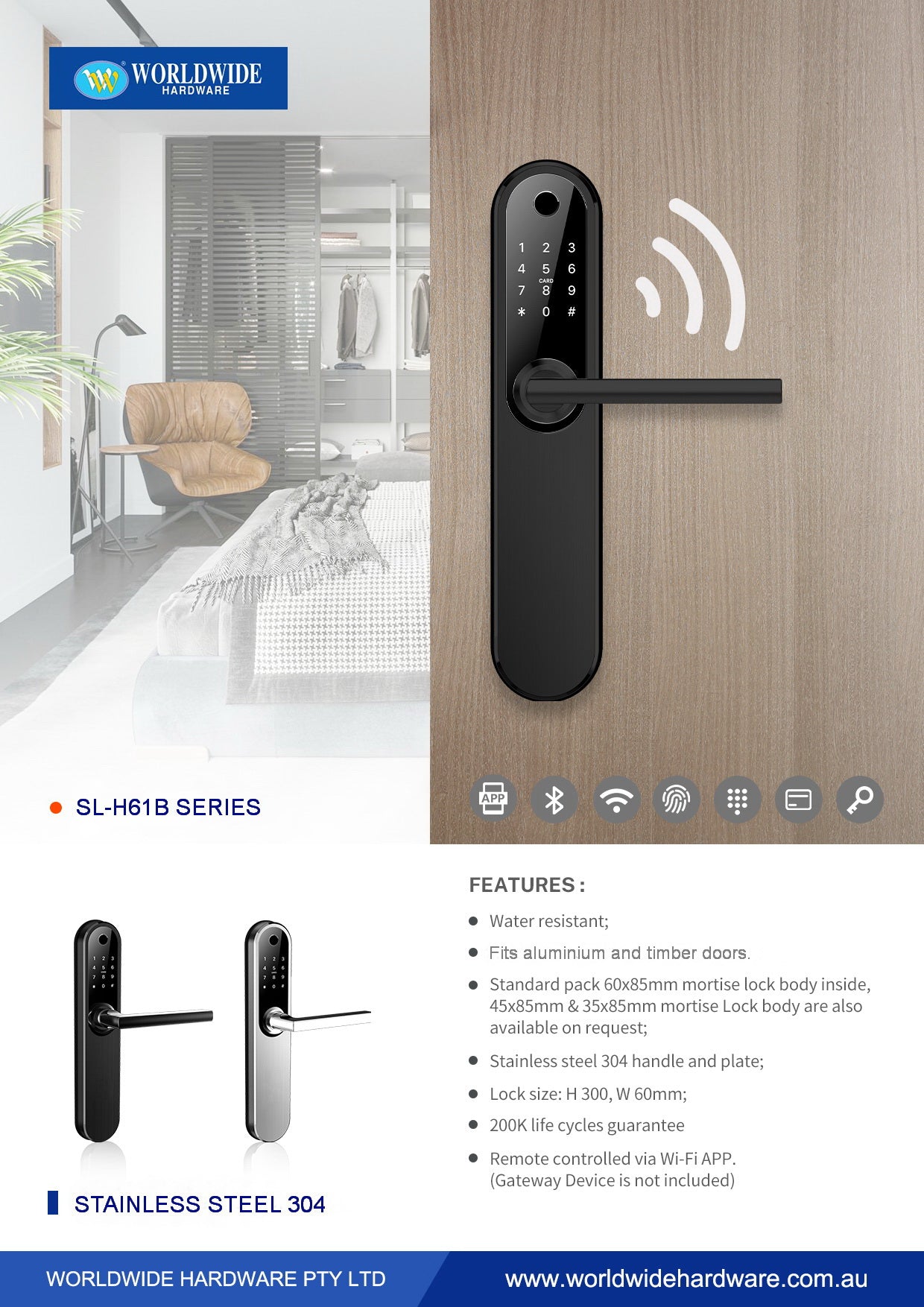 Touch Pad, Finger Print, Wifi (Gateway Device not Included), App, RFID Card,, Key