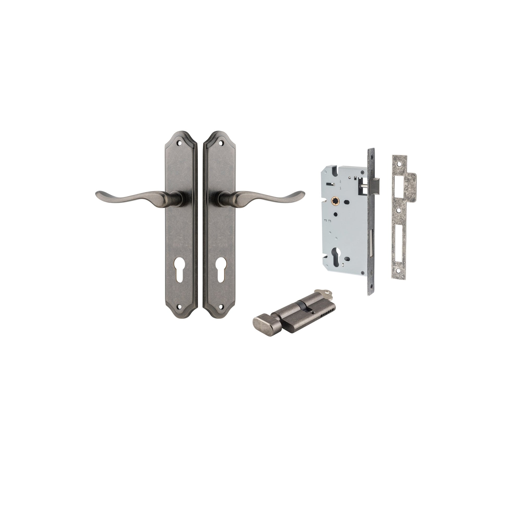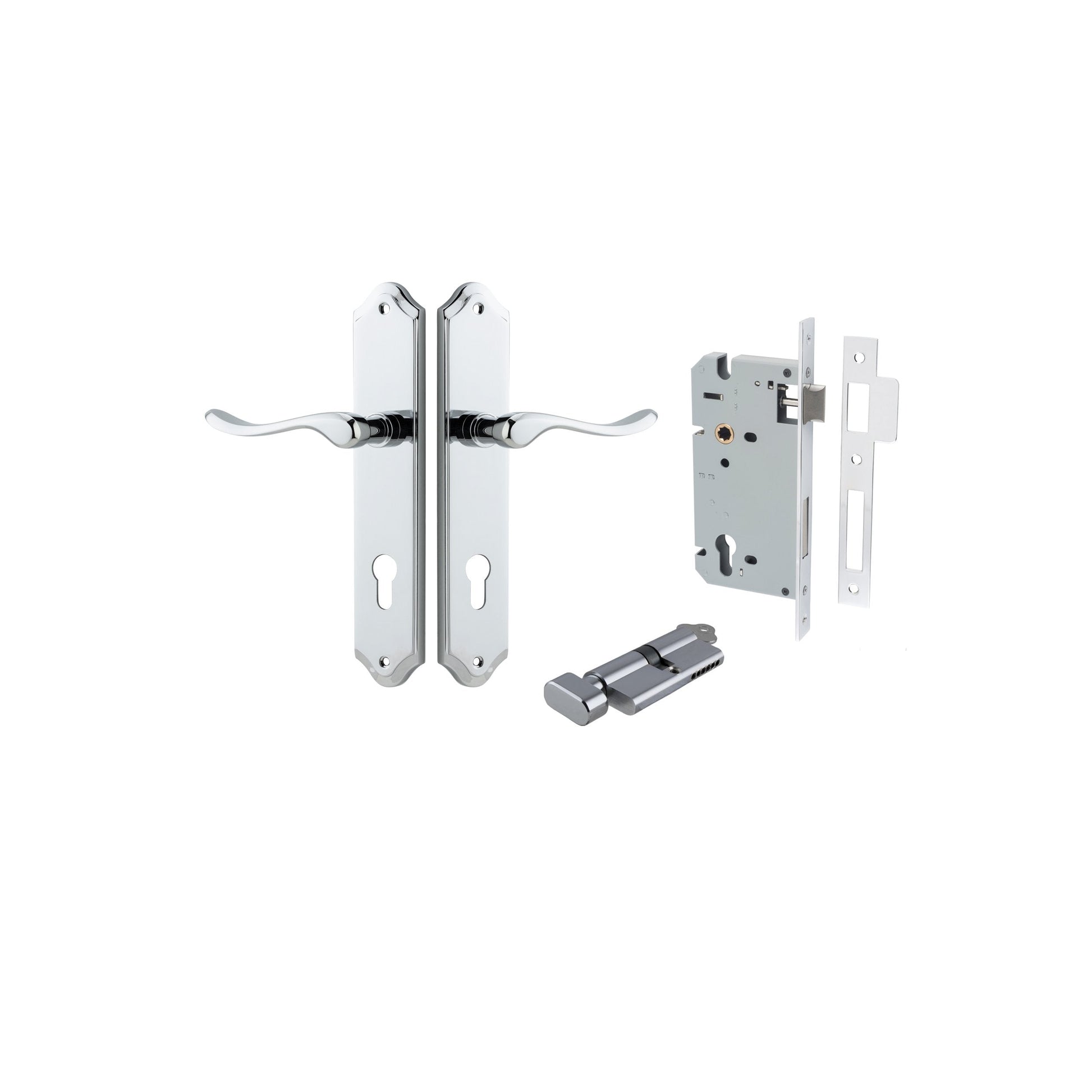 Kit Content: 2 x Levers / Knobs on Backplates of your choice 1 x Euro Mortice Lock CTC85mm Backset 60mm 1 x Face Plate 1 x Striker Plate 1 x Euro Cylinder 5 Pin Dual Function or Key / Thumb 2 x Keys 1 x Standard Spindle 2 x Sprung Spindles 2 x Tie Bolts 18 x Screws 1 x Dust Box 1 x Drill Template 1 x Instruction Manual