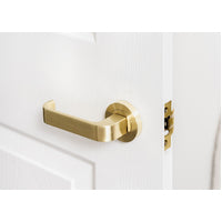 Specifications: Rose Diameter: 54mm Material: Solid Brass Finish: Satin Brass Available Function: Integrated Privacy Set Leverset Only Passage Set Privacy Set Entrance Set 70mm (Key/Key) Entrance Set 70m (Key/Turn)