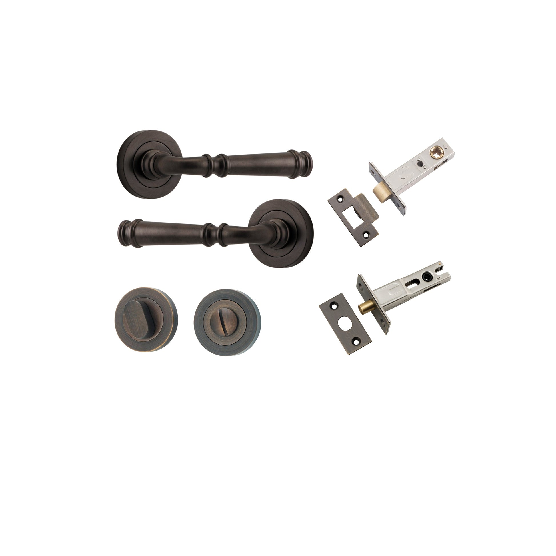Kit Content: 2 x Levers on Round / Square Roses of your choice 1 x Tube Latch Split Cam Backset 60mm 1 x Face Plate 1 x Striker Plate 1 x Privacy Turn Oval Concealed Fix Round / Square 1 x Privacy Bolt Round Backset 60mm 1 x Standard Spindle 2 x Sprung Spindles 2 x Privacy Spindles 39 x Screws 2 x Dust Boxes 2 x Allen Keys* 4 x Grub Screws* 1 x Drill Template 1 x Instruction Manual *With Square Rose only